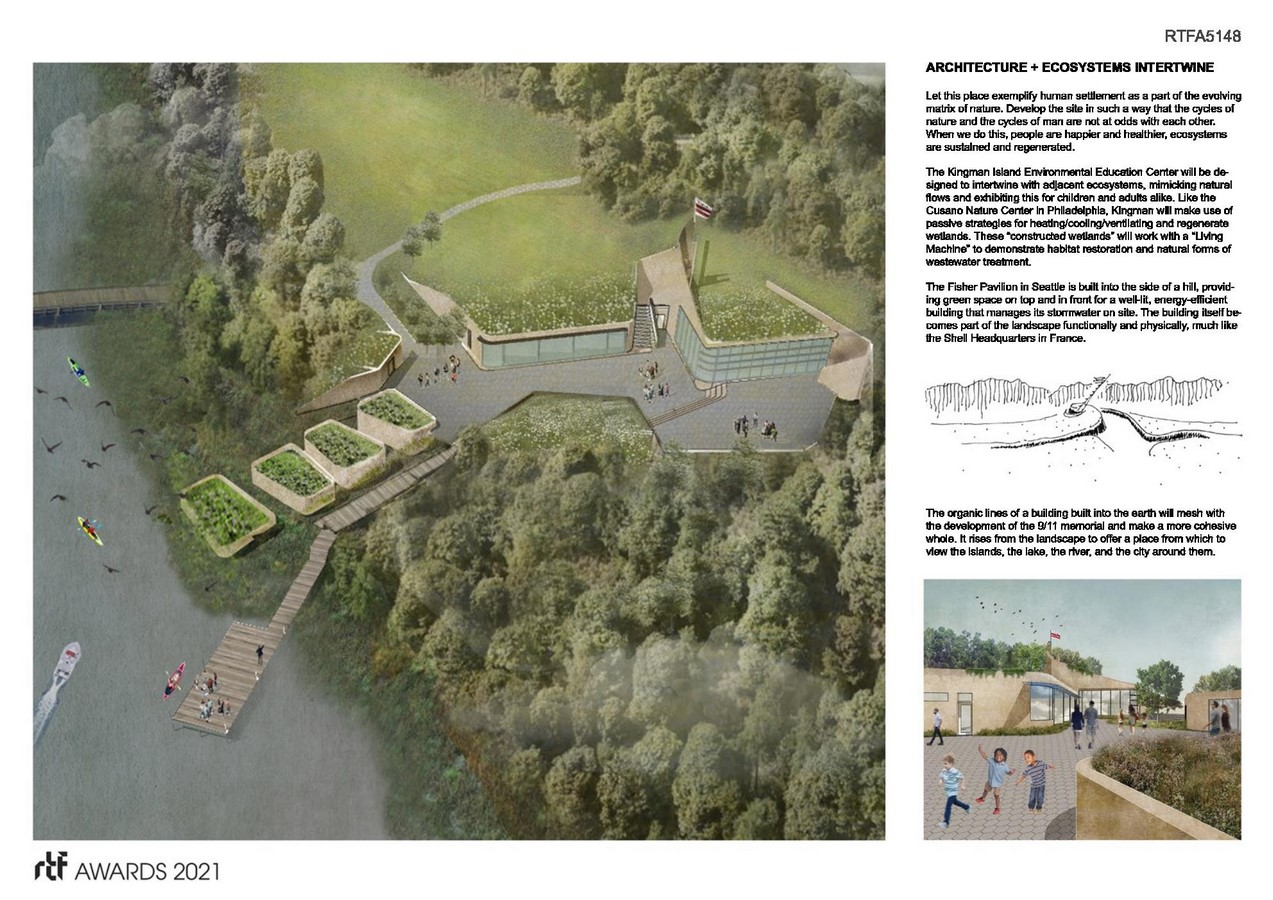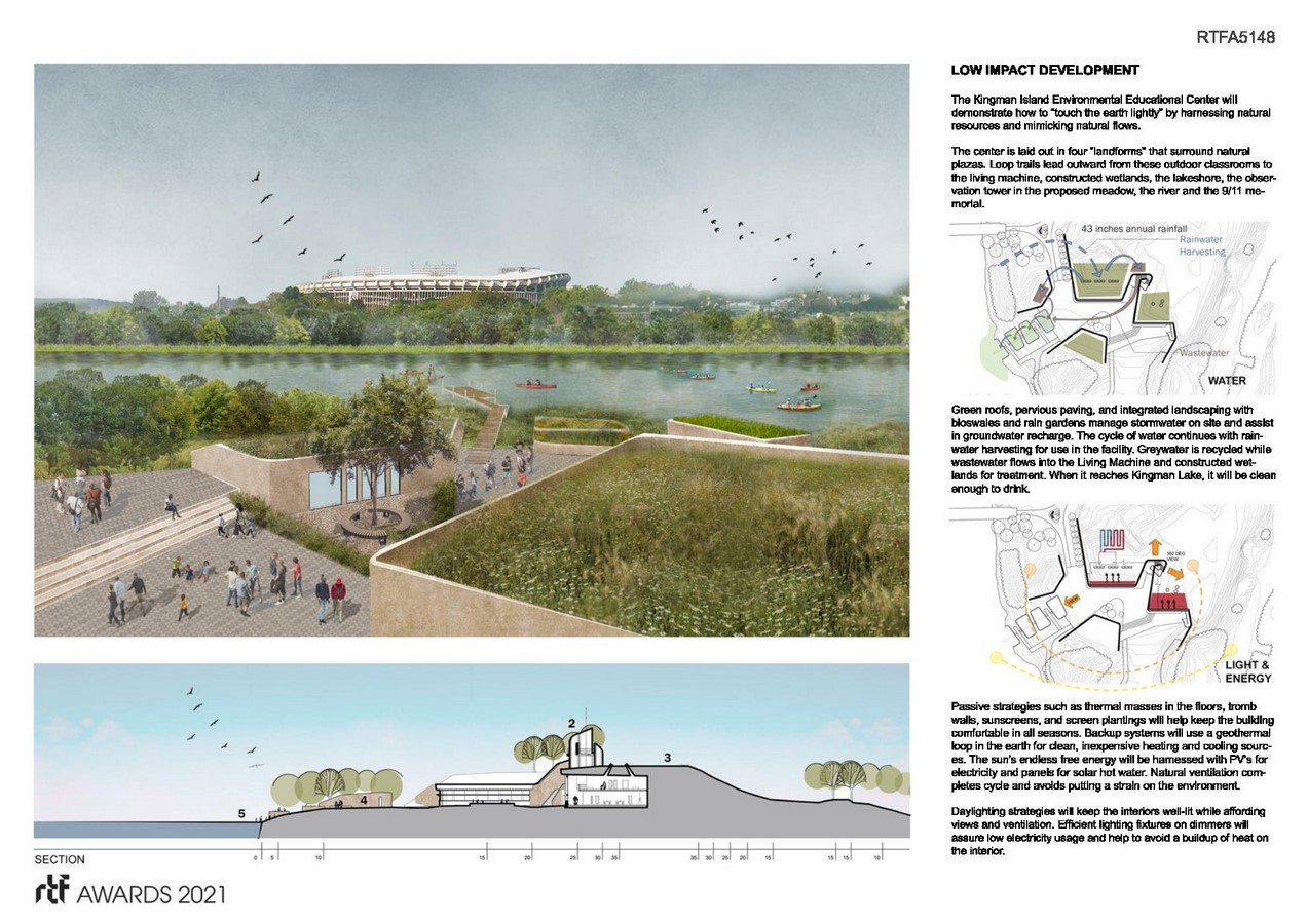 The Kingman Island Environmental Education Center will be designed to intertwine with adjacent ecosystems, mimicking natural flows and exhibiting this for children and adults alike. Kingman will make use of passive strategies for heating/cooling/ventilating and regenerate wetlands. These “constructed wetlands” will work with a “Living Machine” to demonstrate habitat restoration and natural forms of wastewater treatment. The building itself becomes part of the landscape functionally and physically.