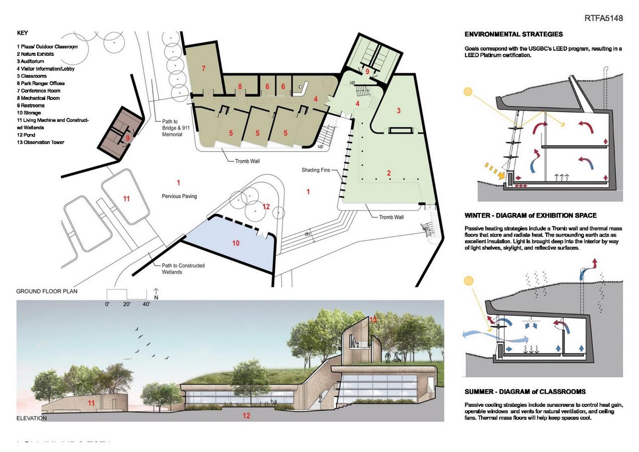 The center is laid out in four “landforms” that surround natural plazas. Loop trails lead outward from these outdoor classrooms to the living machine, constructed wetlands, the lakeshore, the observation tower in the proposed meadow, the river and the 9/11 memorial.