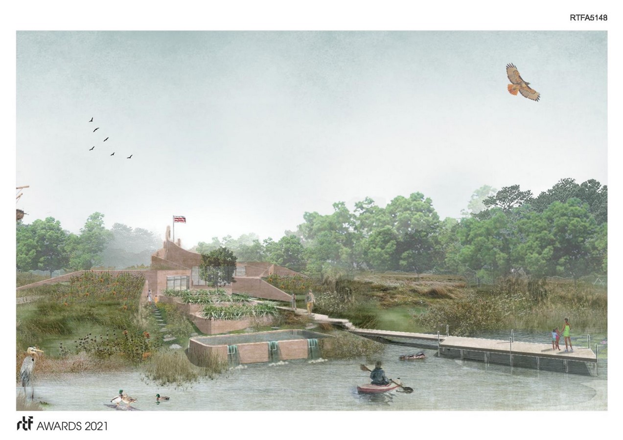The Kingman Island Environmental Education Center will be designed to intertwine with adjacent ecosystems, mimicking natural flows and exhibiting this for children and adults alike. Kingman will make use of passive strategies for heating/cooling/ventilating and regenerate wetlands. These “constructed wetlands” will work with a “Living Machine” to demonstrate habitat restoration and natural forms of wastewater treatment. The building itself becomes part of the landscape functionally and physically.