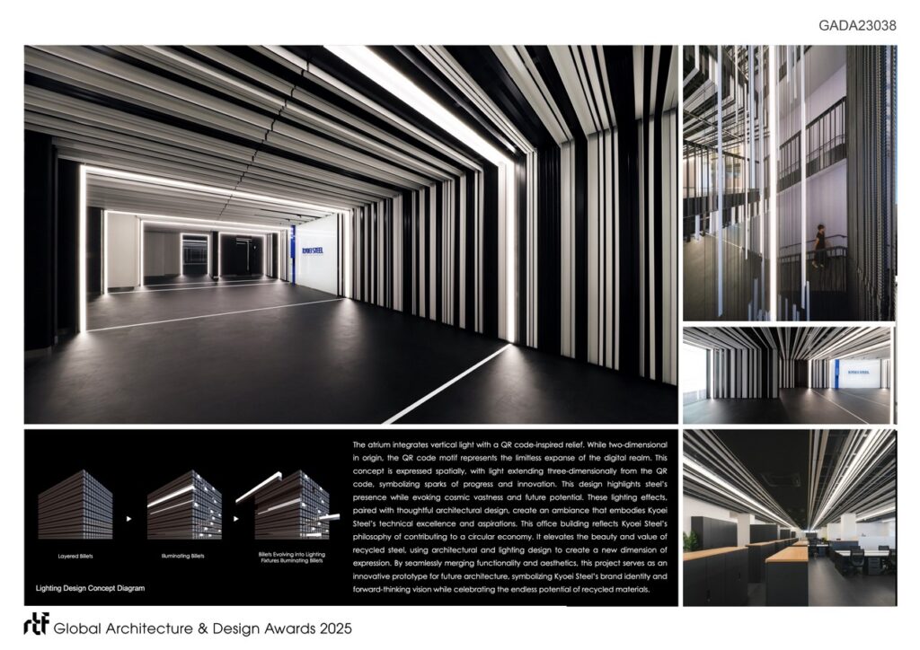 This interplay of light, shadow, and raw steel highlights Kyoei Steel’s technological strength and innovative spirit. Dynamic lighting effects embody the company’s brand identity. By showcasing materials and integrating values, the project harmonizes functionality and design. Rooted in the company’s recycling philosophy, it presents a prototype for architecture merging sustainability, innovation, and identity with a unique spatial experience.