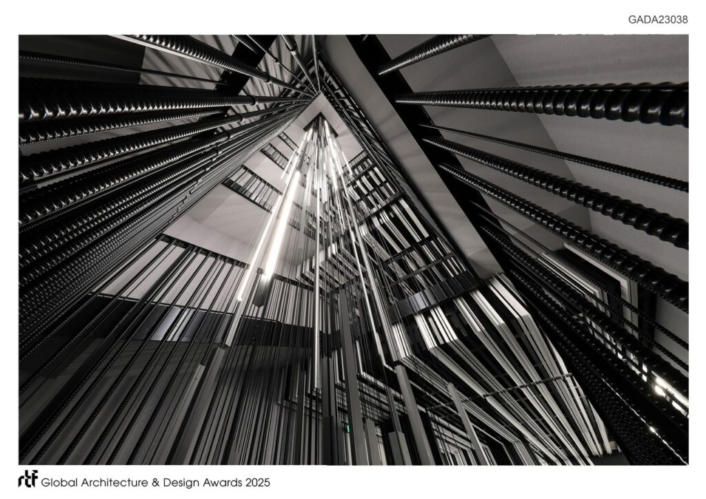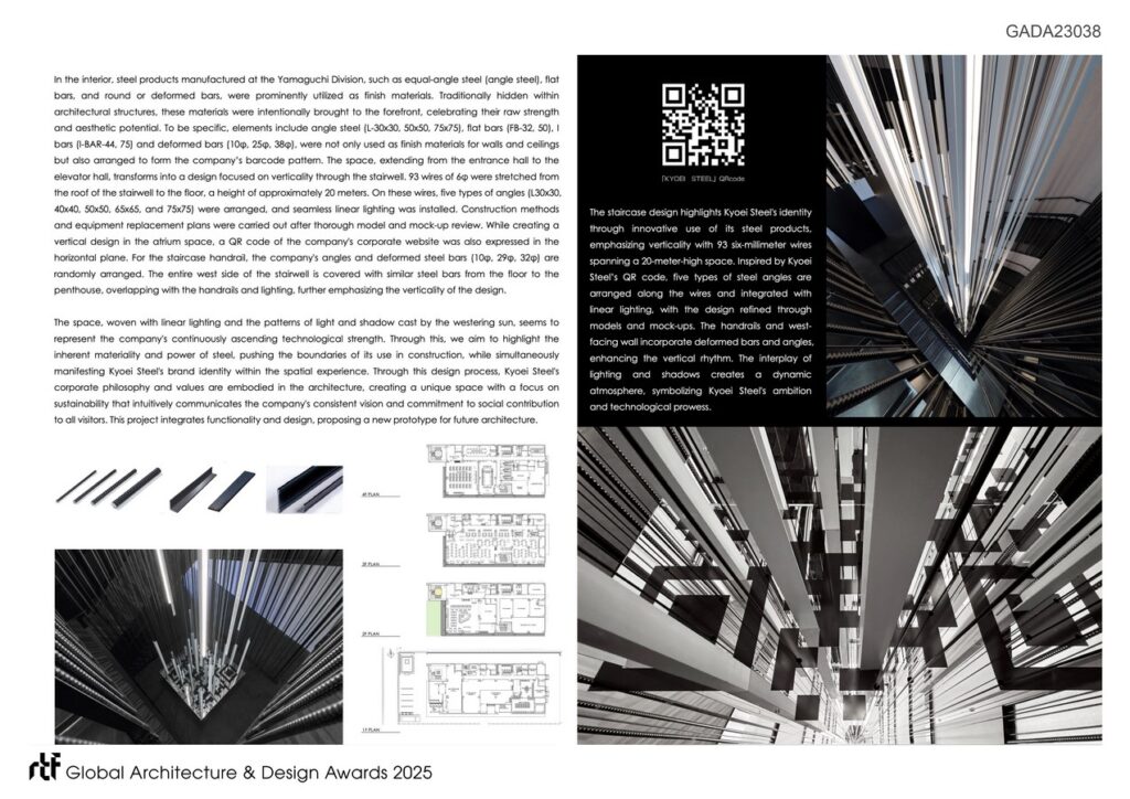 Inside, steel products from the Yamaguchi Division, such as equal-angle steel, flat bars, and deformed bars, are prominently featured as finish materials, celebrating their raw strength and aesthetic potential. Materials like angle steel (L30x30, 50×50, 75×75), flat bars (FB-32, 50), I-bars (I-BAR-44, 75), and deformed bars (10φ, 25φ, 38φ) were used for walls, ceilings, and the company’s barcode pattern. The stairwell features 93 wires (6φ) stretched across 20 meters, with five types of angles and seamless lighting. A QR code of the company’s website is integrated into the horizontal plane, while staircase handrails use randomly arranged angles and deformed steel bars. On the west side, similar steel bars cover the stairwell from floor to penthouse, interacting with handrails and lighting to emphasize verticality.