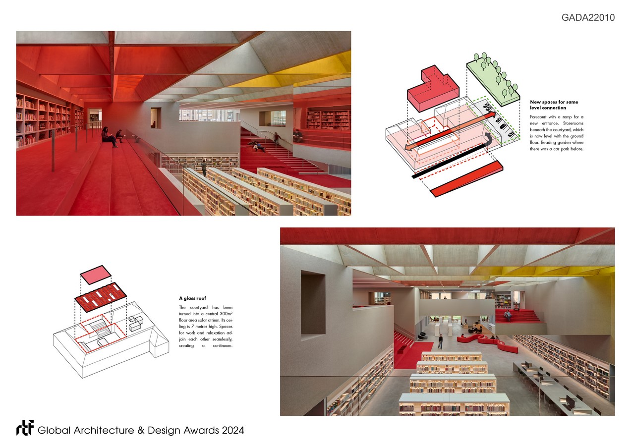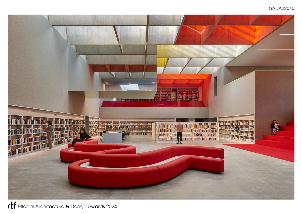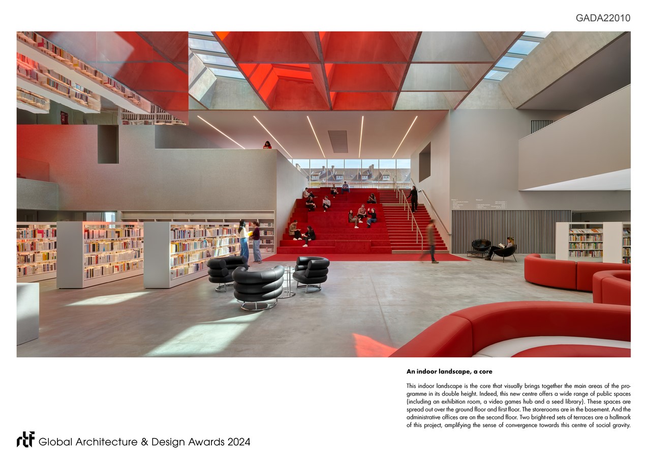 From this approach, a central solar atrium with a 300m2 floor area was born. Its ceiling is 7 metres high. Here, spaces for work and relaxation adjoin each other seamlessly, creating a continuum: an indoor landscape and a core that visually brings together the main areas of the programme in its double height. Indeed, this new centre offers a wide range of public spaces (including an exhibition room, a video games hub and a seed library). These spaces are spread out over the ground floor and 1st floor. The storerooms are in the basement. And the administrative offices are on the 2nd floor. 2 bright-red sets of terraces are a hallmark of this project. They are placed in staggered rows on the sides of the reading space, amplifying the sense of convergence towards this centre of social gravity.