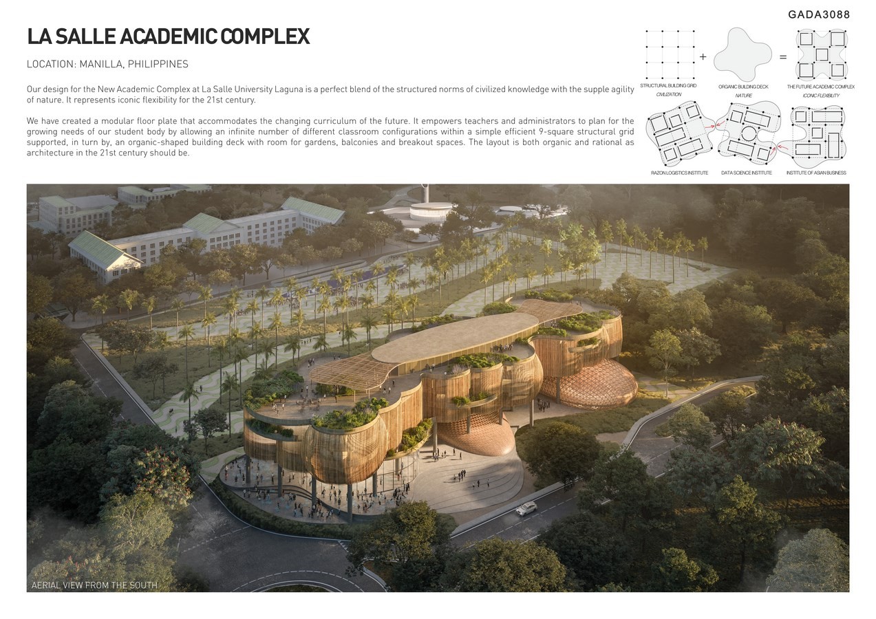 Inspired by how nature makes room for growth, we believe that architecture can learn from the ways in which our environment accommodates change. Our design for the New Academic Complex at La Salle University Laguna is a perfect blend of the structured norms of civilized knowledge with the supple agility of nature. It represents iconic flexibility for the 21st century.