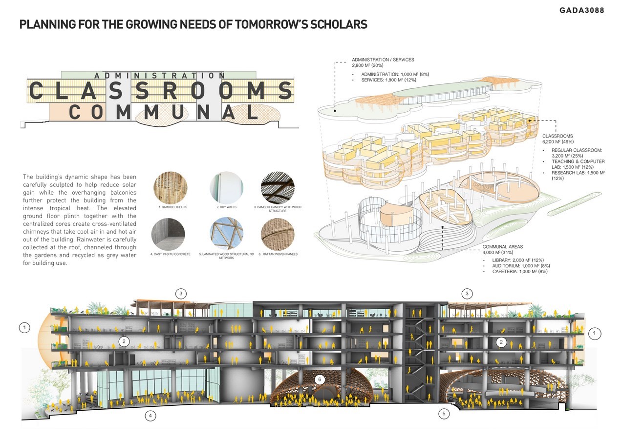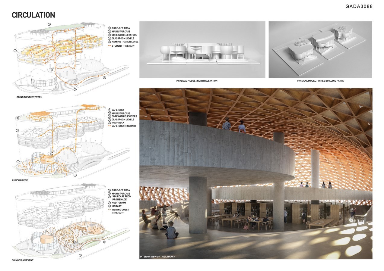 The ground floor is lifted on 8-meter high pilotis and placed a curvilinear plinth that extends outwards creating smooth transitions between the surrounding landscape and the building. Students will be able to sit on the steps like at an ancient Greek amphitheater while the cafeteria, library and auditorium each have a spacious monumental entry overlooking the campus.