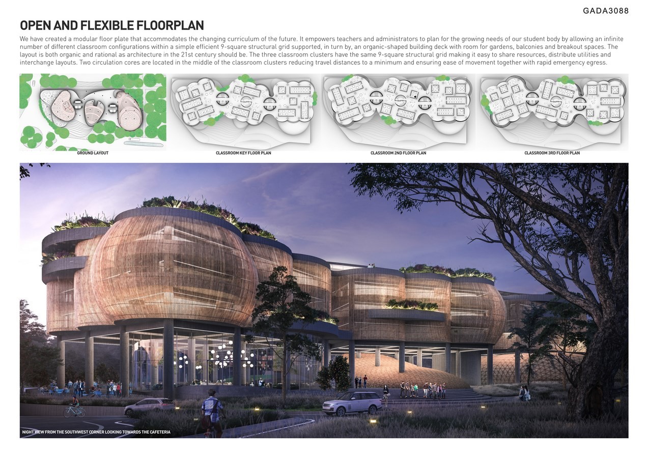 We have created a modular floor plate that accommodates the changing curriculum of the future. It empowers teachers and administrators to plan for the growing needs of our student body by allowing an infinite number of different classroom configurations within a simple efficient 9-square structural grid supported, in turn by, an organic-shaped building deck with room for gardens, balconies and breakout spaces.
