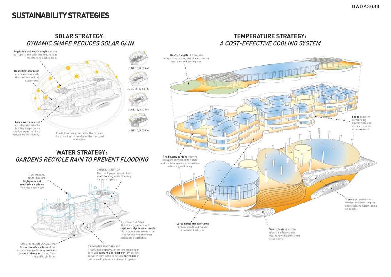 The building’s dynamic shape has been carefully sculpted to help reduce solar gain while the overhanging balconies further protect the building from the intense tropical heat. The elevated ground floor plinth together with the centralized cores create cross-ventilated chimneys that take cool air in and hot air out of the building. Rainwater is carefully collected at the roof, channeled through the gardens and recycled as grey water for building use.