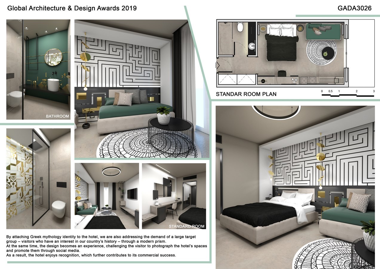 We employed the geometry of the labyrinth in order to enhance the visitor’s “journey,” aiming to inspire memories that are directly connected with ancient Greek history. For example, in the design of the rooms, the labyrinth either dominates the space as a visual element (two-dimensional representation) or serves a functional purpose (as a three-dimensional construction).