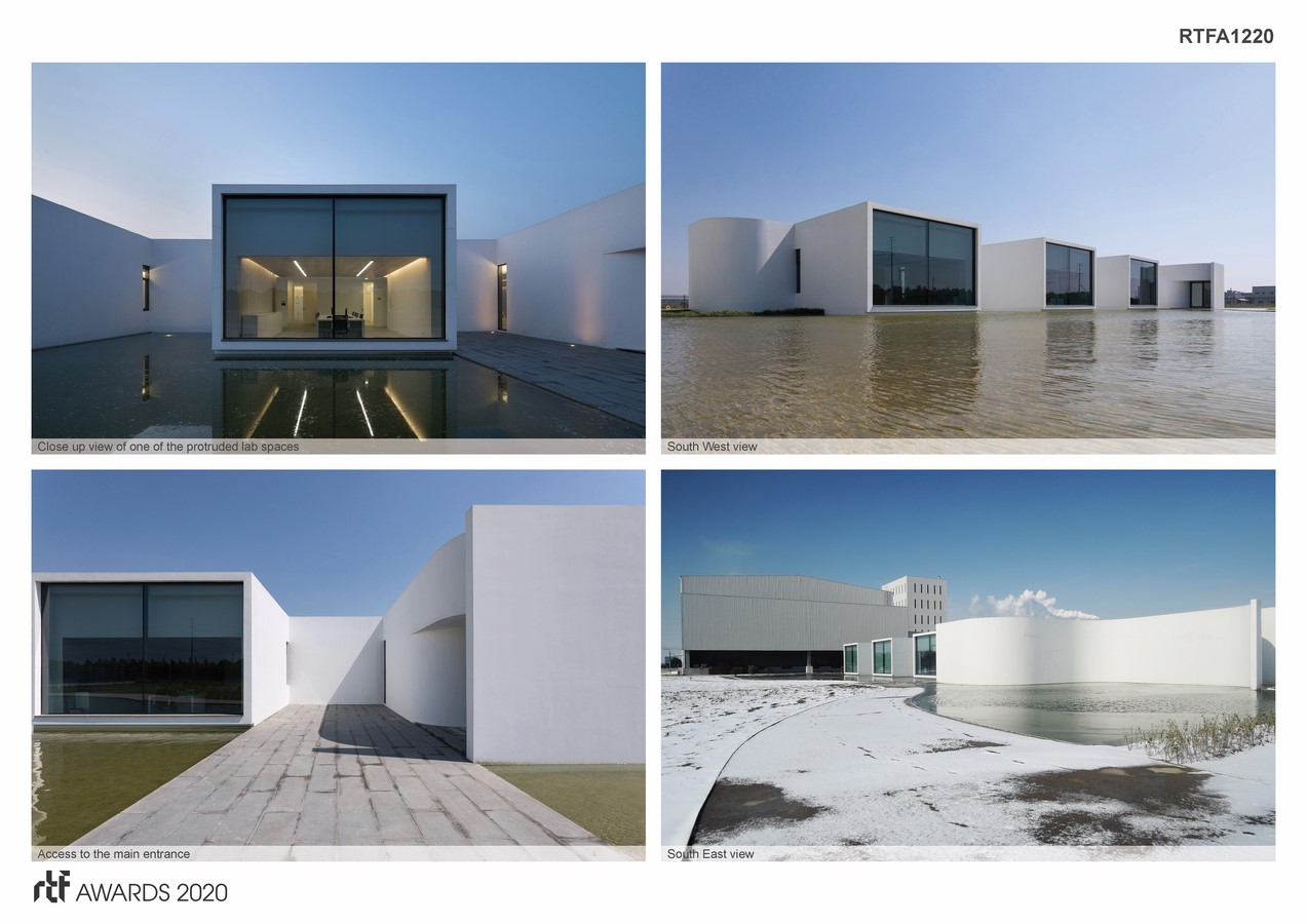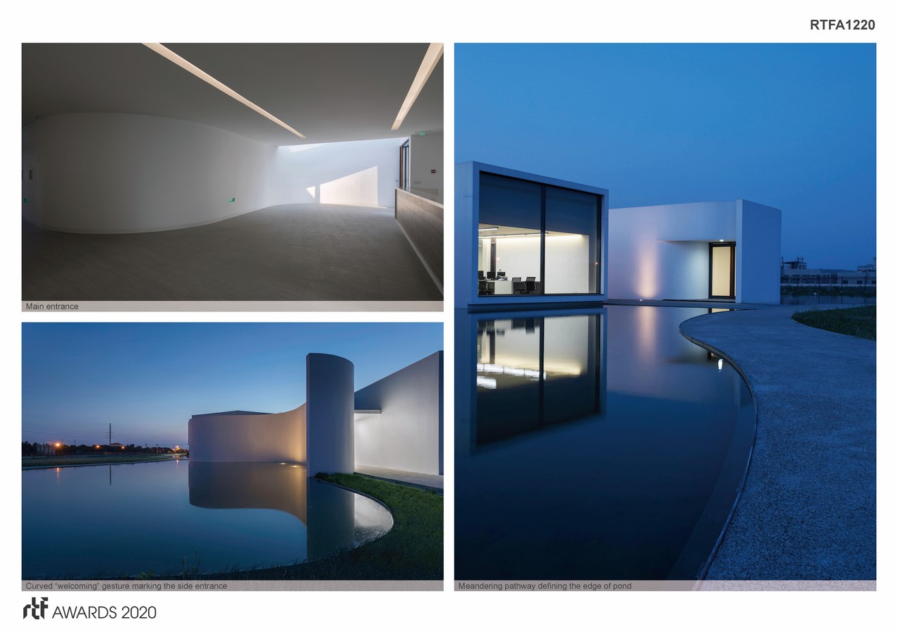 - While the main building geometries are rectilinear, entrances and key elevations are characterized by contrasting fluid curvatures to give various welcoming gestures to visitors and staff.