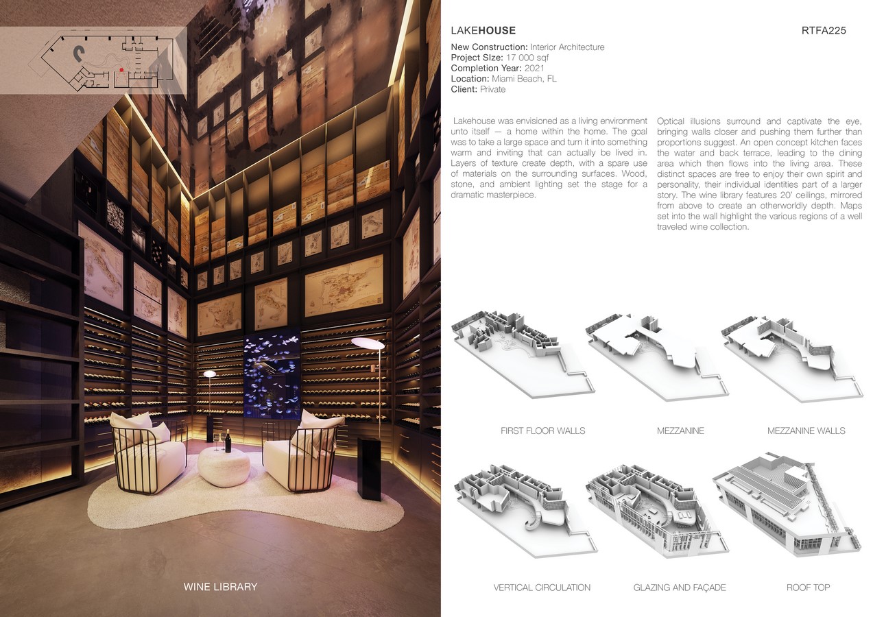 These distinct spaces are free to enjoy their own spirit and personality, their individual identities part of a larger story. The wine library features 20’ ceilings, mirrored from above to create an otherworldly depth. Maps set into the wall highlight the various regions of a well-traveled wine collection.