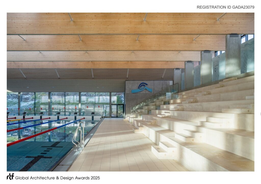 Inside, the facility contains a 50-meter, 10-lane competition pool built to FINA standards. In addition, there is a warm-up pool, a training pool, and a children’s pool. Flexibility has been a guiding principle: the venue can host major international competitions yet equally supports daily training, school groups, and families. Acoustics, lighting, and circulation have been carefully resolved, ensuring that the building is functional, energy-efficient, and welcoming.