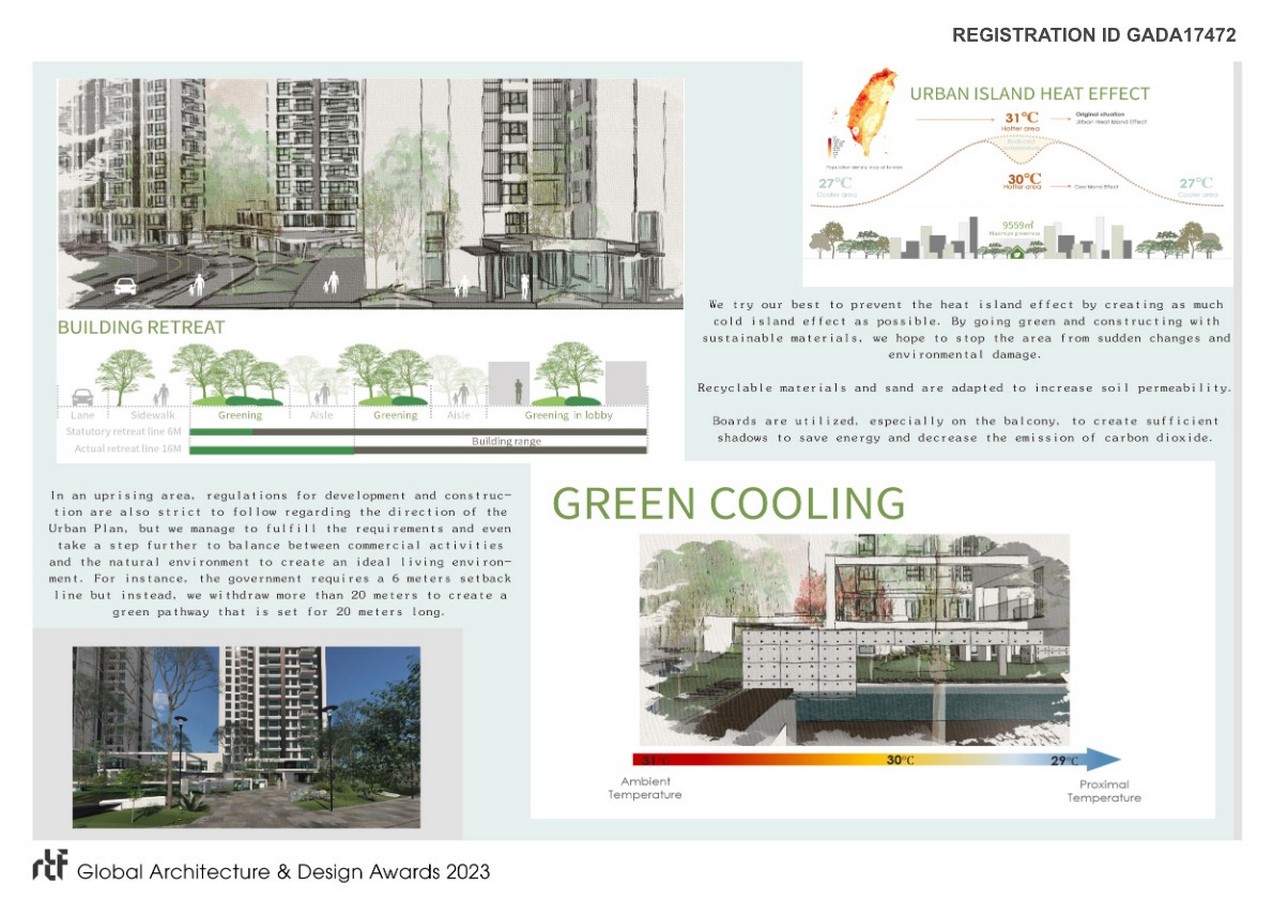 We also take extra care in our construction. As the increase in population inevitably brought carbon emissions, we try our best to prevent the heat island effect by creating as much cold island effect as possible. By going green and constructing with sustainable materials, we hope to stop the area from sudden changes and environmental damage. First, recyclable materials and sand are adapted to increase soil permeability. Boards are utilized, especially on the balcony, to create sufficient shadows to save energy and decrease the emission of carbon dioxide. What’s more, we emphasize lightweight construction to minimize the potential threats of earthquakes and maximize the earthquake-resistant function. Finally, North-South oriented buildings setting for better ventilation to reduce humidity and limit the number of windows on the East-West side to prevent exposure from the sunlight.