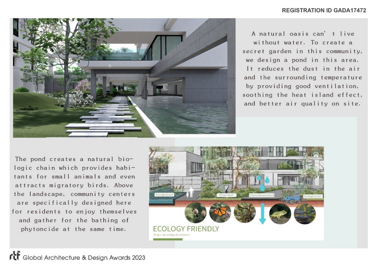 To create a secret garden in this community, we also design a pond in this area. It reduces the dust in the air and the surrounding temperature by providing good ventilation, soothing the heat island effect, and better air quality on site. What’s more, the pond creates a natural biologic chain which provides habitants for small animals and even attracts migratory birds. Above the landscape, community centers are specifically designed here for residents to enjoy themselves and gather for the bathing of phytoncide at the same time.