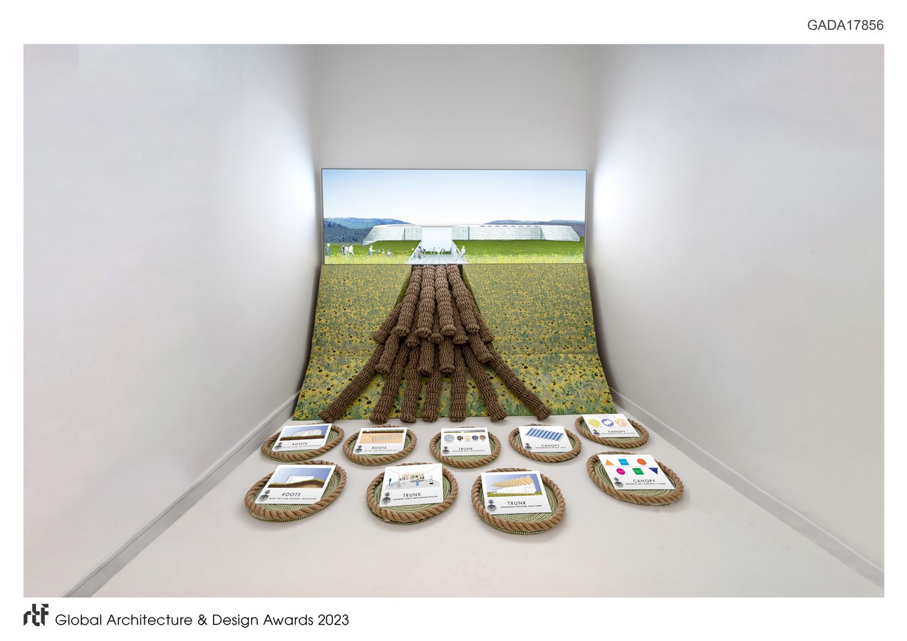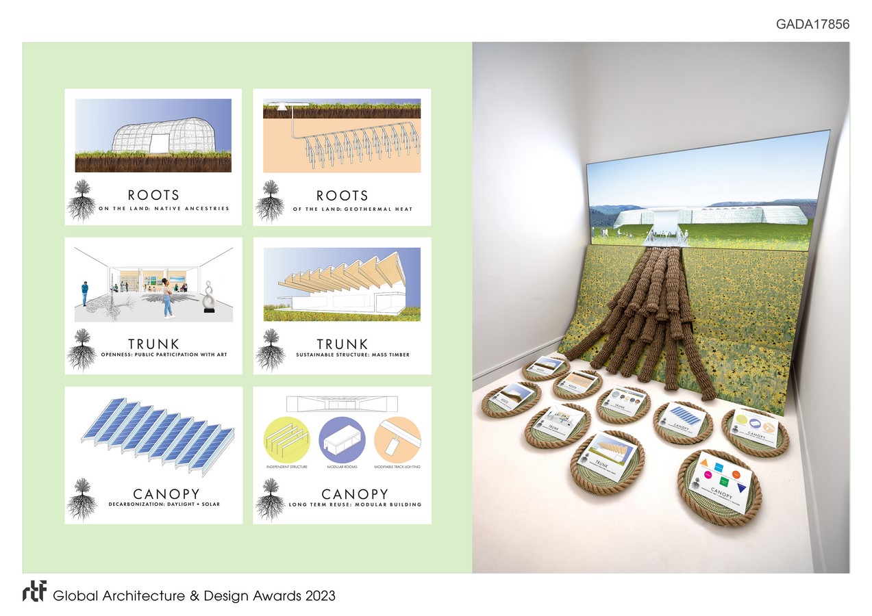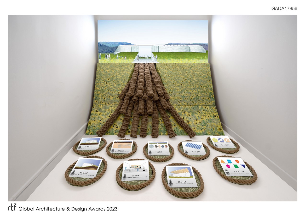 The installation considers how cultural architectural projects can become one with their surrounding landscapes. Although it is specifically a display of conceptual ideas, it literally lays out on the floor of the exhibit multiple architectural approaches that we can explore to sustainably embed our cultural projects into their context. Whether researching native ancestry, structuring forms with local mass timber, or powering environments with site specific geothermal heat, today’s cultural built form must integrally unite with their native milieu.