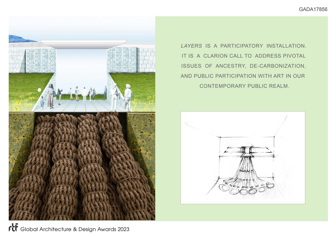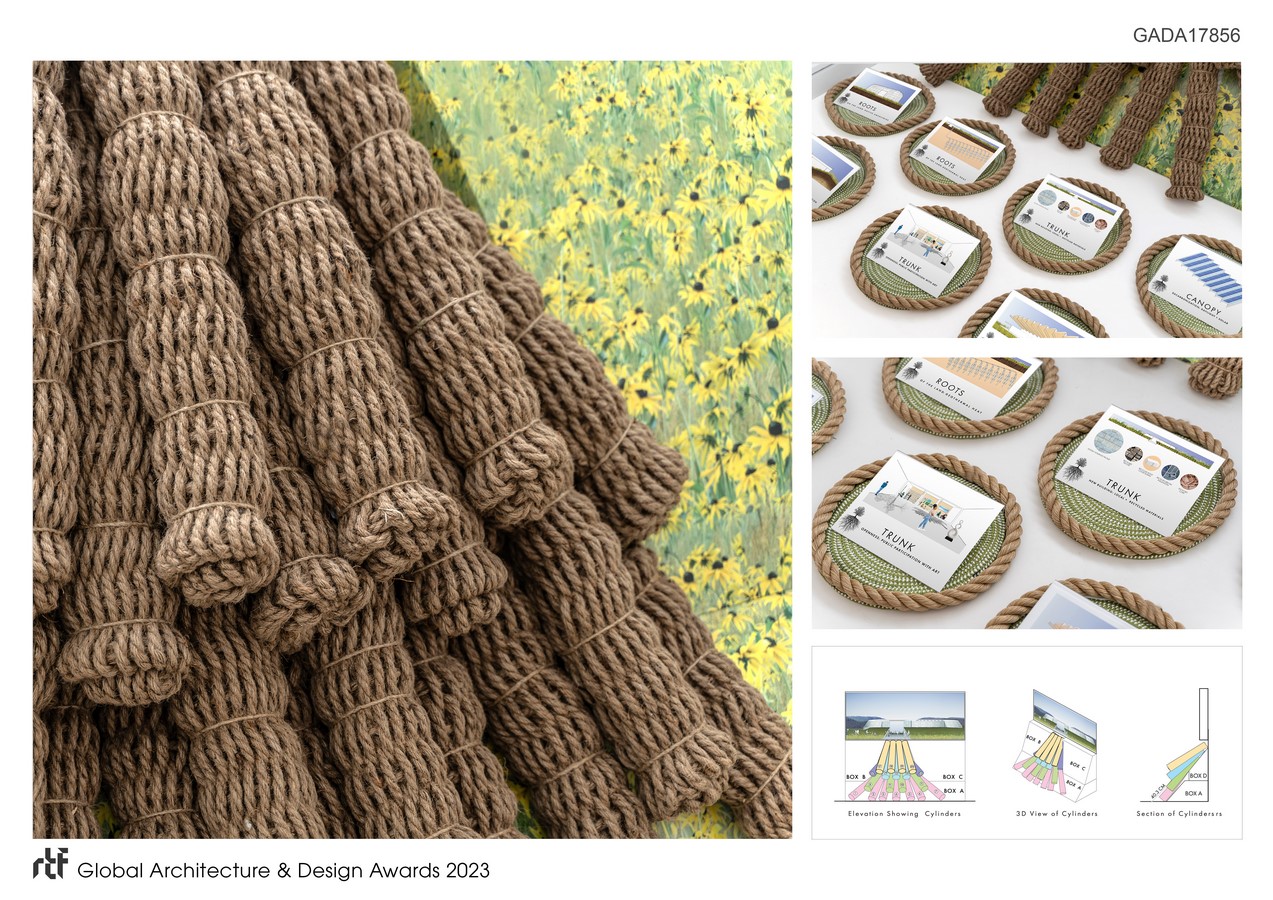 The exhibit depicts a moment in time in the woodlands where image, materiality and oral conversation intertwine. Together they address pivotal issues of ancestry, de-carbonization, and public participation with art in our contemporary public realm. The physical metaphor of a tree with its hyper-exaggerated jute roots splaying three-dimensionally into the earth displays the need to incorporate critical contemporary architectural investigations early on in our architectural design process.