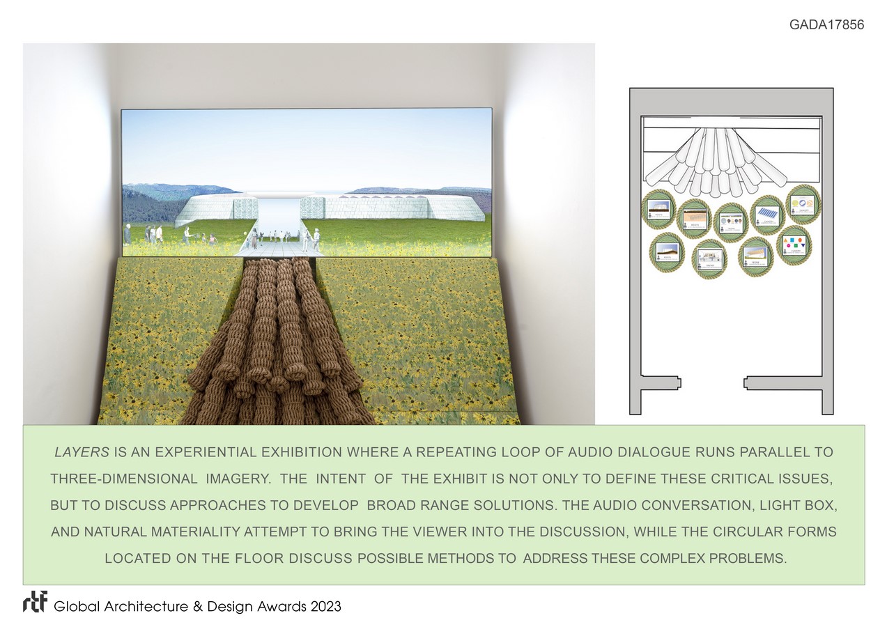 The intent of the exhibit is not only to define these critical issues, but to discuss approaches to develop broad range solutions. The audio conversation, light box, and natural materiality attempt to bring the viewer into the discussion, while the circular forms located on the floor discuss possible methods to address these complex problems. The installation is participatory. It is a clarion call to our communities to investigate the interconnected architectural components of our cultural arts institutions today and in the future.