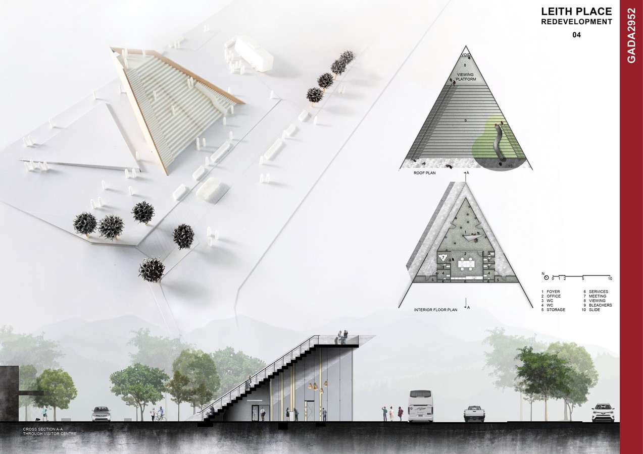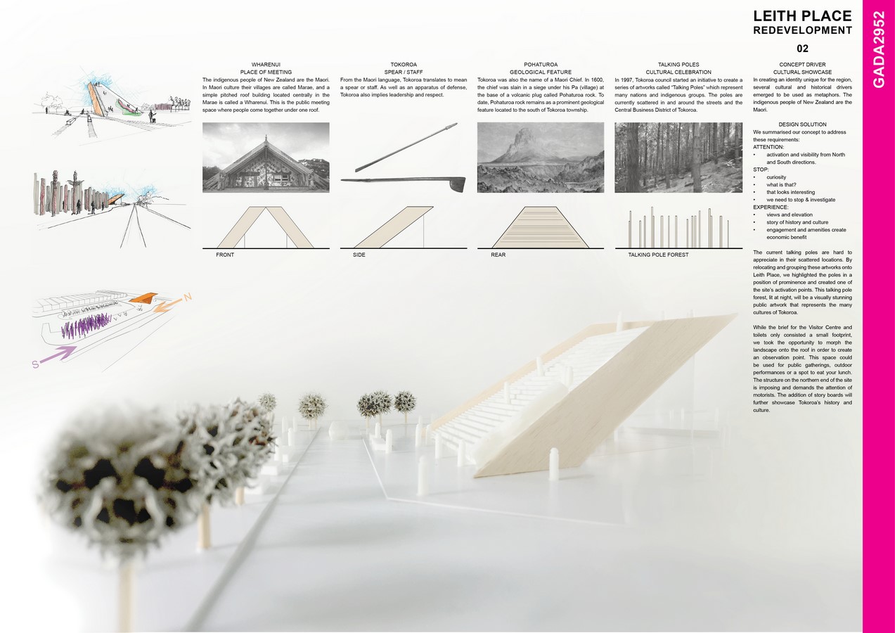 Our solution is to activate the long and narrow site. We decided to create activation points located on the northern and southern ends of Leith Place. These would be the beacons to catch the interest of motorists and allow time to turn off from State Highway 1.