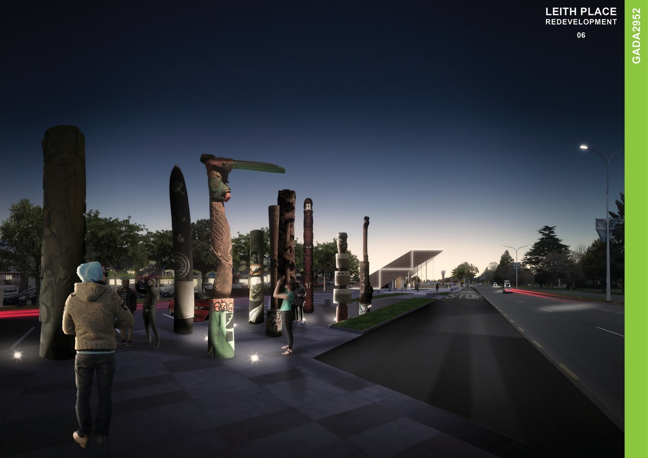 On the southern end of the site, we brought together existing Talking Poles” to highlight these poles in a position of prominence and create the second activation point. This talking pole forest, lit at night, will be a visually stunning public artwork that represents the many cultures of Tokoroa.