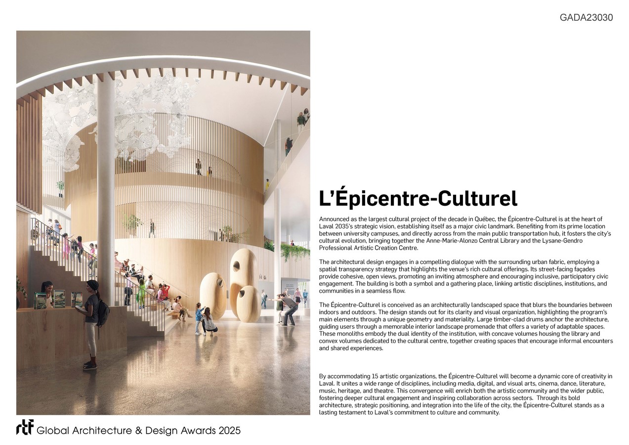The Épicentre-Culturel is conceived as an architecturally landscaped space that blurs the boundaries between indoors and outdoors. The design stands out for its clarity and visual organization, highlighting the program’s main elements through a unique geometry and materiality. Large timber-clad drums anchor the architecture, guiding users through a memorable interior landscape promenade that offers a variety of adaptable spaces. These monoliths embody the dual identity of the institution, with concave volumes housing the library and convex volumes dedicated to the cultural centre, together creating spaces that encourage informal encounters and shared experiences.