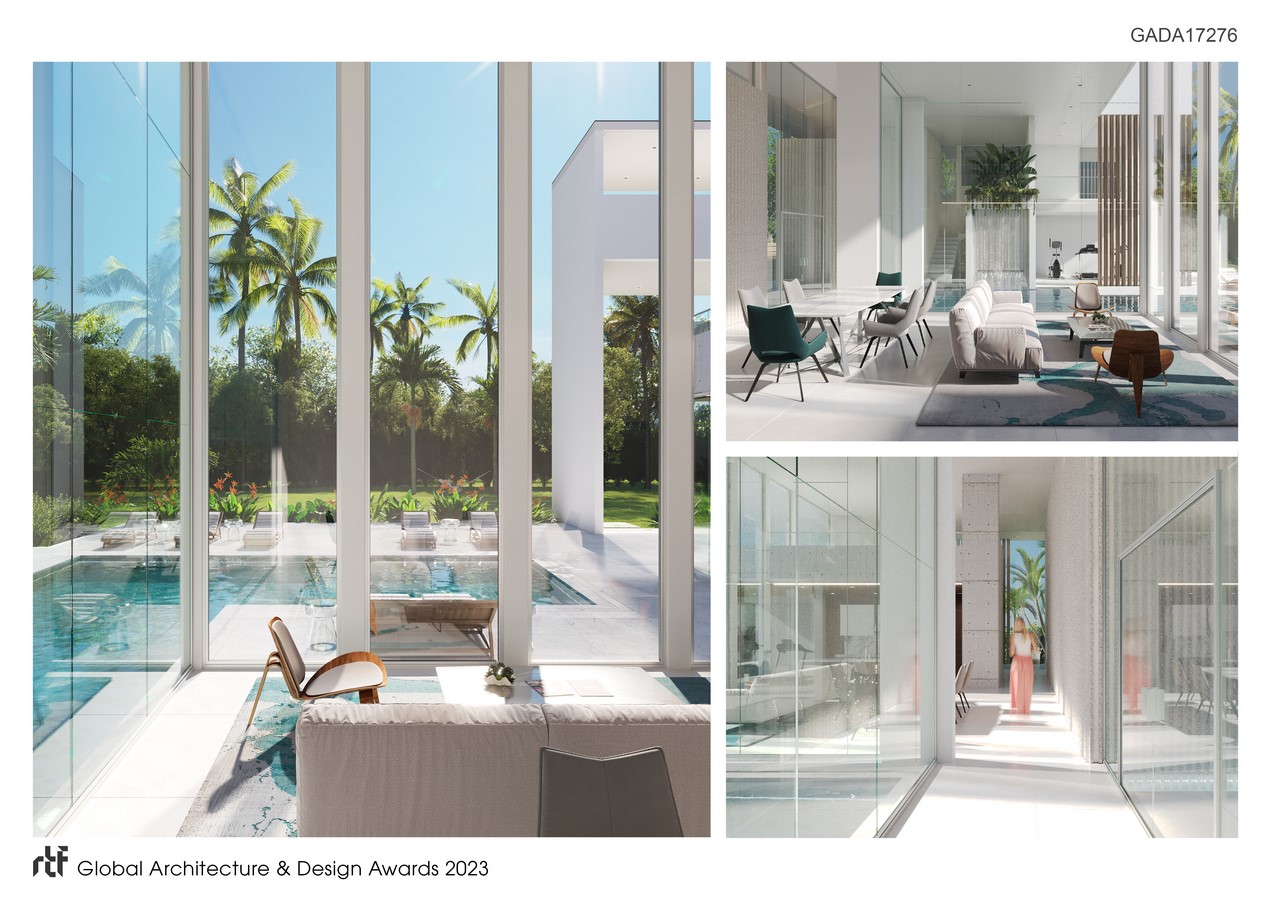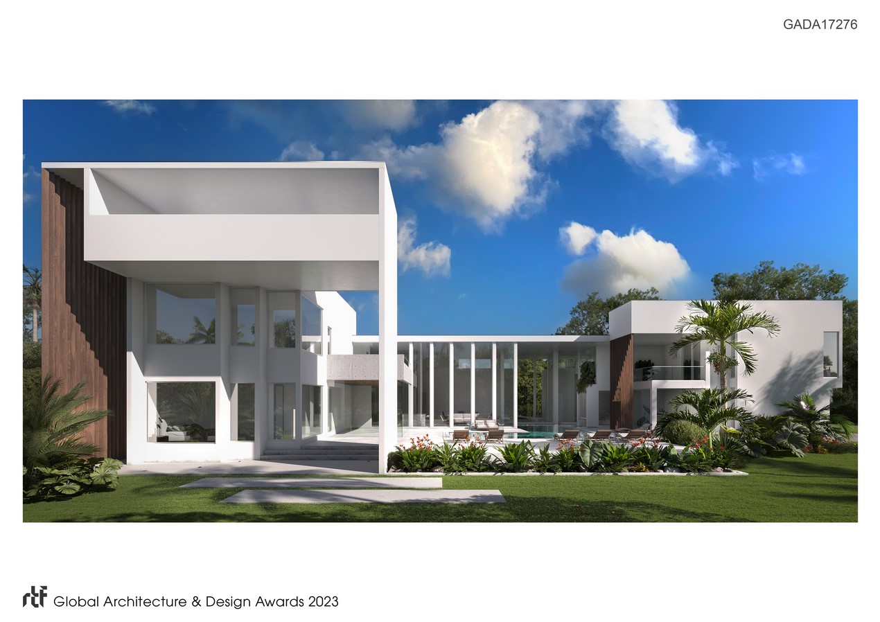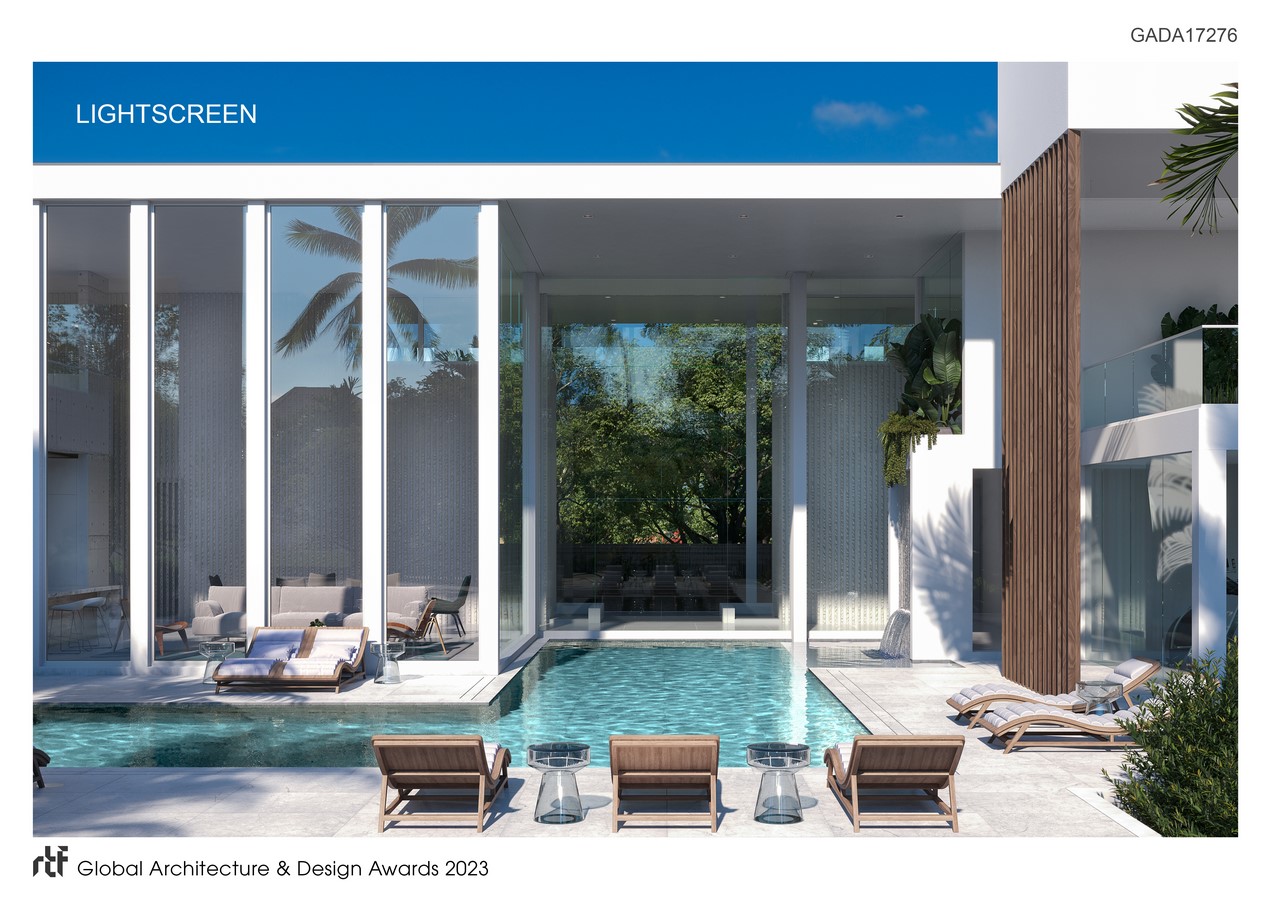 The resulting project is a site-specific expression of regional modernism that responds to Southwest Florida’s harsh tropical climate and sun. The property dictated that the long axis of the residence is oriented north-south, unlike neighboring structures. Due to this orientation, eastern and western heat gain had to be controlled. The eastern façade is shielded by a large, fixed canopy that provides passive shading, reducing heat gain by 70%. The southern and western facades incorporate operable vertical and horizontal sunscreens, allowing the owner to control what is opened and by how much (0%-100%).