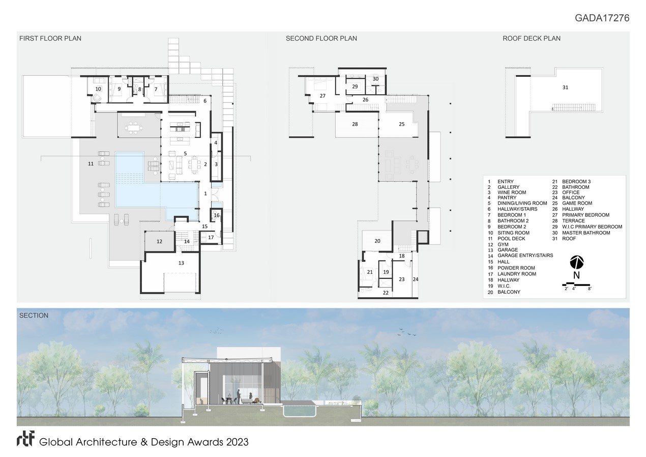 The building palette is limited to five materials: concrete, wood, steel, aluminum, and impact-resistant glass, and the landscape design includes only Florida-native plants. Purposefully built on a grid for reducing construction waste, the project explores the properties of concrete through its implementation in various forms.