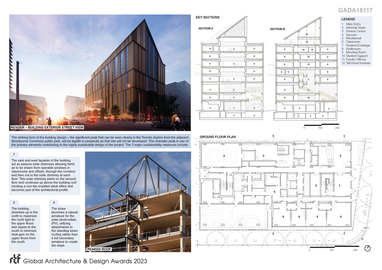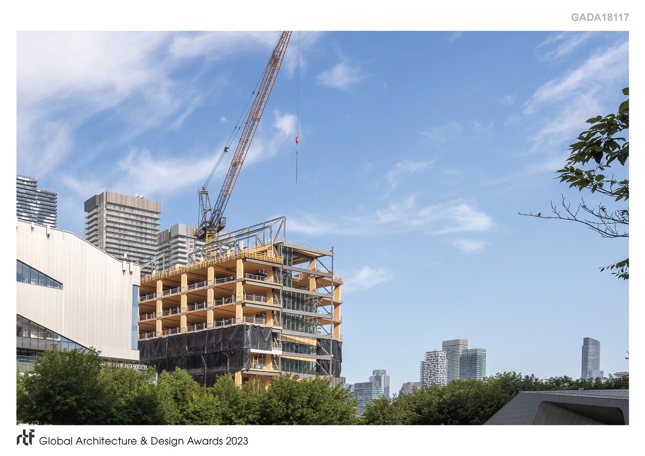The remarkable aspiration of this building is the use of exposed mass timber in an educational building where the assembly occupancies and the teaching spaces occupy the full verticality of the building, with research centres at the top of the building and classrooms on every level. This is one of the first built projects in the world to use exposed mass timber to this height for this occupancy.