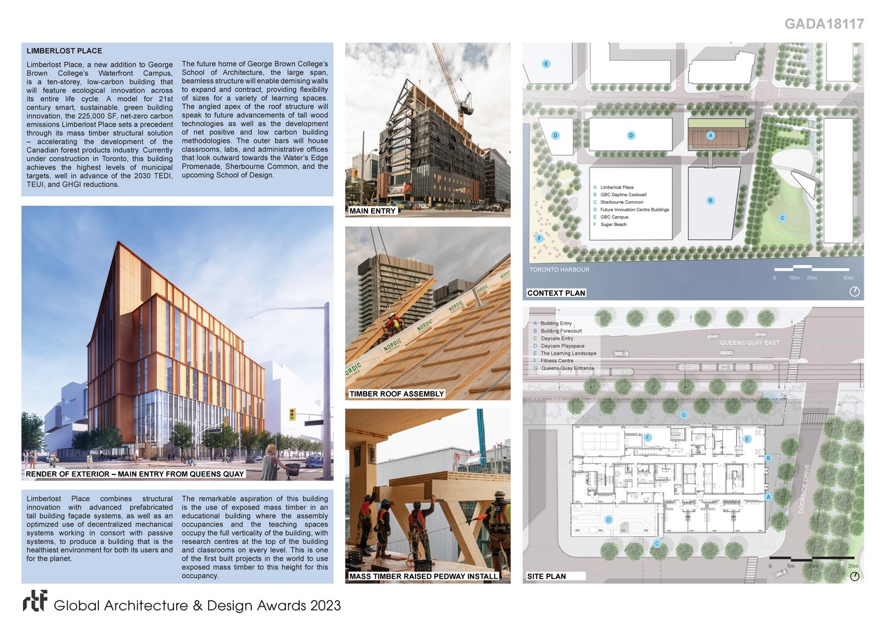 Limberlost Place, a new addition to George Brown College’s Waterfront Campus, is a ten-storey, low-carbon building that will feature ecological innovation across its entire life cycle. A model for 21st century smart, sustainable, green building innovation, the 225,000 SF, net-zero carbon emissions Limberlost Place sets a precedent through its mass timber structural solution – accelerating the development of the Canadian forest products industry. Currently under construction in Toronto, this building achieves the highest levels of municipal targets, well in advance of the 2030 TEDI, TEUI, and GHGI reductions.