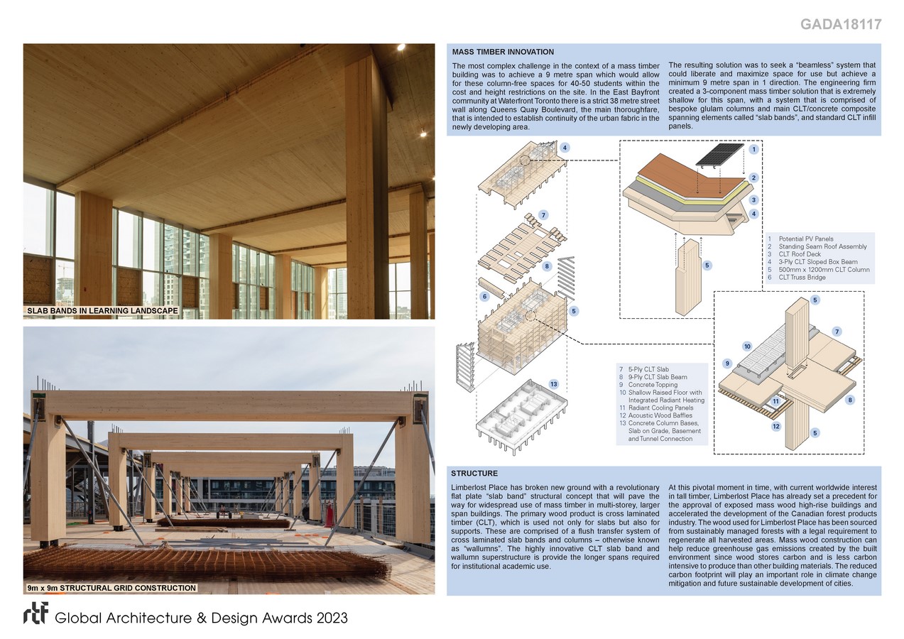 At this pivotal moment in time, with current worldwide interest in tall timber, Limberlost Place has already set a precedent for the approval of exposed mass wood high-rise buildings and accelerated the development of the Canadian forest products industry. The wood used for Limberlost Place has been sourced from sustainably managed forests with a legal requirement to regenerate all harvested areas. Mass wood construction can help reduce greenhouse gas emissions created by the built environment since wood stores carbon and is less carbon intensive to produce than other building materials. The reduced carbon footprint will play an important role in climate change mitigation and future sustainable development of cities.