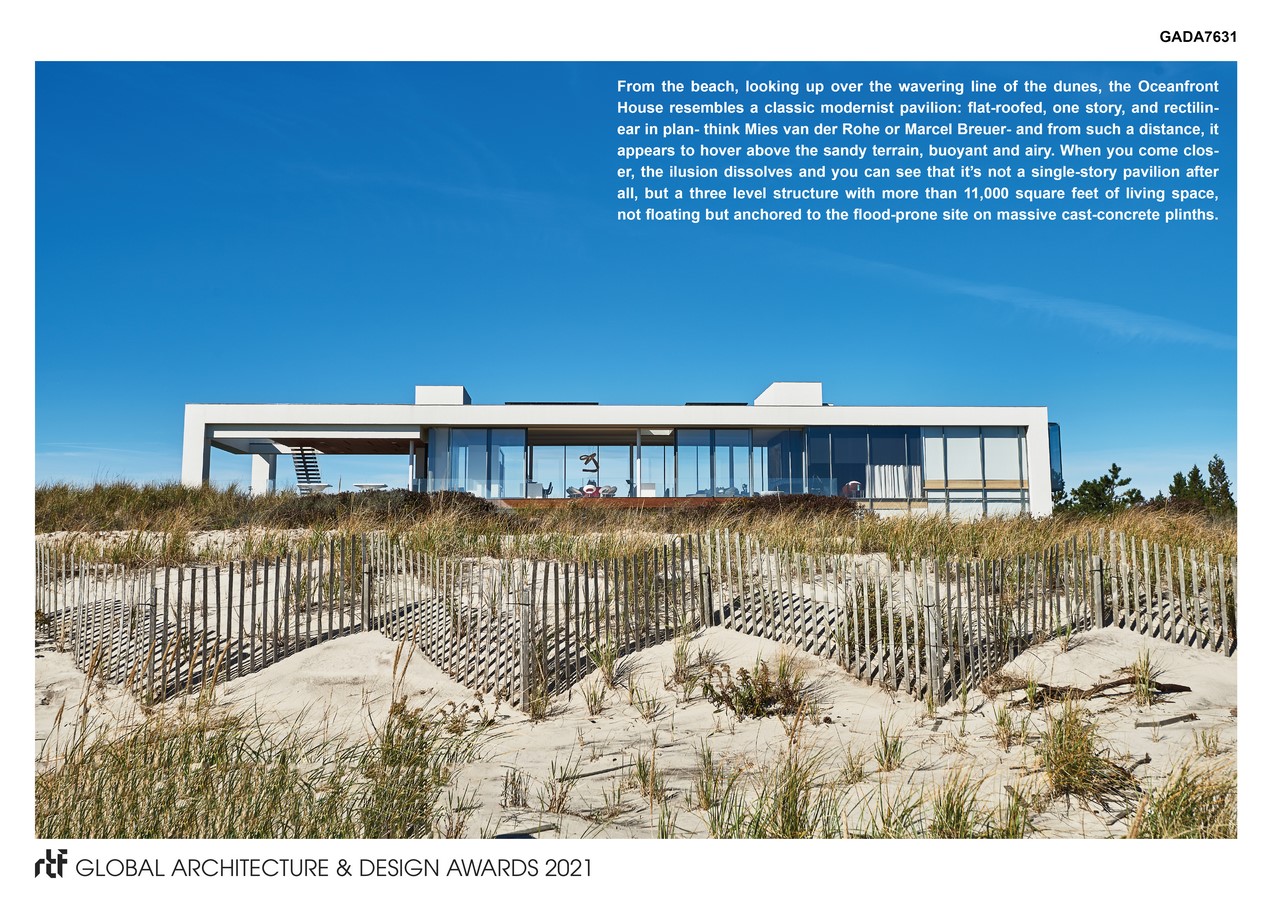 Standing sentinel on a narrow beach site flanked by the Atlantic Ocean and a large pond, the home has a form inspired by, and responsive to, its site constraints. To maximize views, the two long sides of the house that run parallel to the shores were designed as curtain-walls of glass while the two short sides are more solid to enforce down-beach privacy. The upper level, floating 42 feet above the ocean below, evokes the serenity of being at sea.