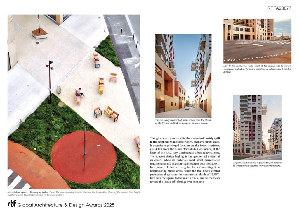 Though shaped by constraints, the square is ultimately a gift to the neighbourhood: a fully open, inclusive public space. It occupies a privileged location on the Seine riverfront, just 400m from the future ‘Parc-de-la-Confluence’, at the heart of the ZAC-Ivry-Confluences urban renewal zone. The square’s design highlights the geothermal system at its centre, while its materials meet strict maintenance requirements and its colour palette aligns with the START-Ivry project. It has a triangular form connecting it to neighbouring public areas, while the two newly created pedestrian alleys cross the commercial plinth of START-Ivry, link the square to the main avenue, and frame views toward the iconic cable bridge over the Seine.