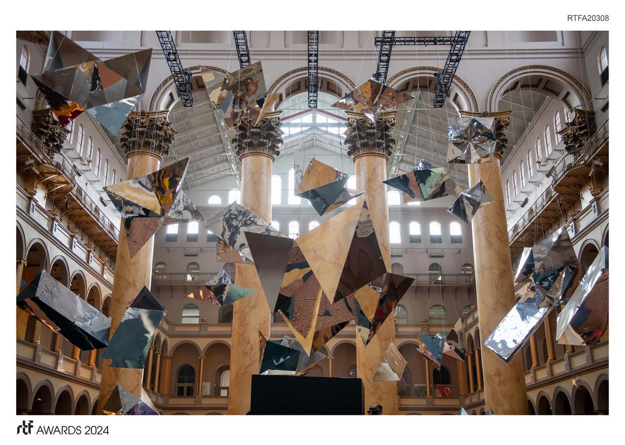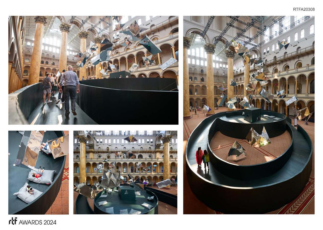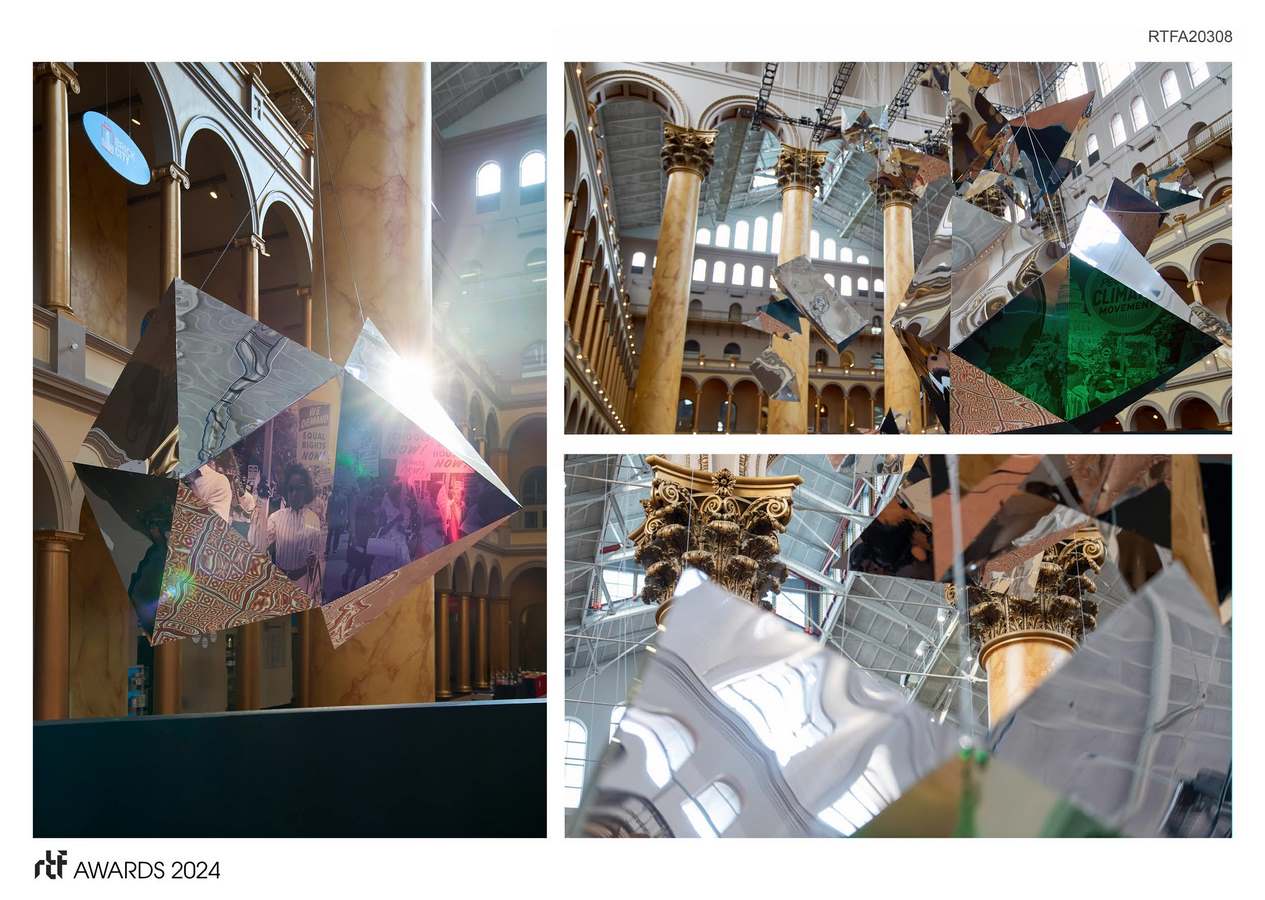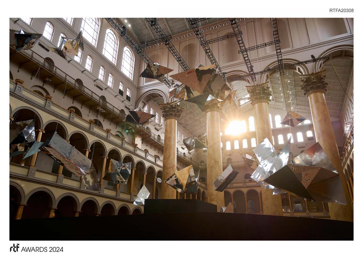 Look Here reveals unexpected reflections of the National Building Museum’s Center Court in Washington, DC. Visitors to the exhibit discover viewports that create individual moments of contemplation among clusters of reflective fractals that expose new facets of the surrounding architecture.