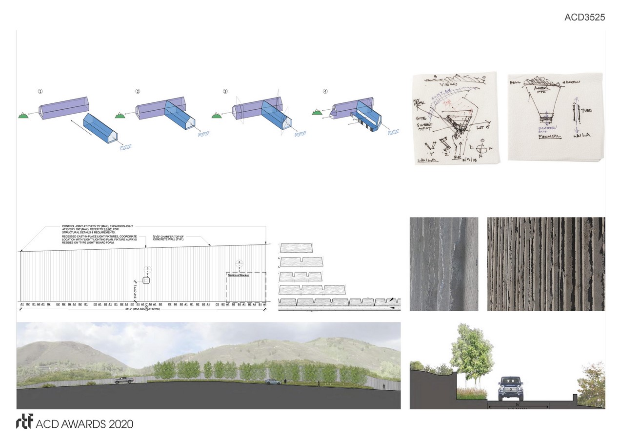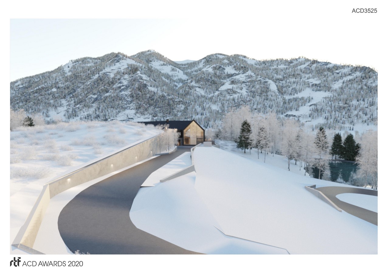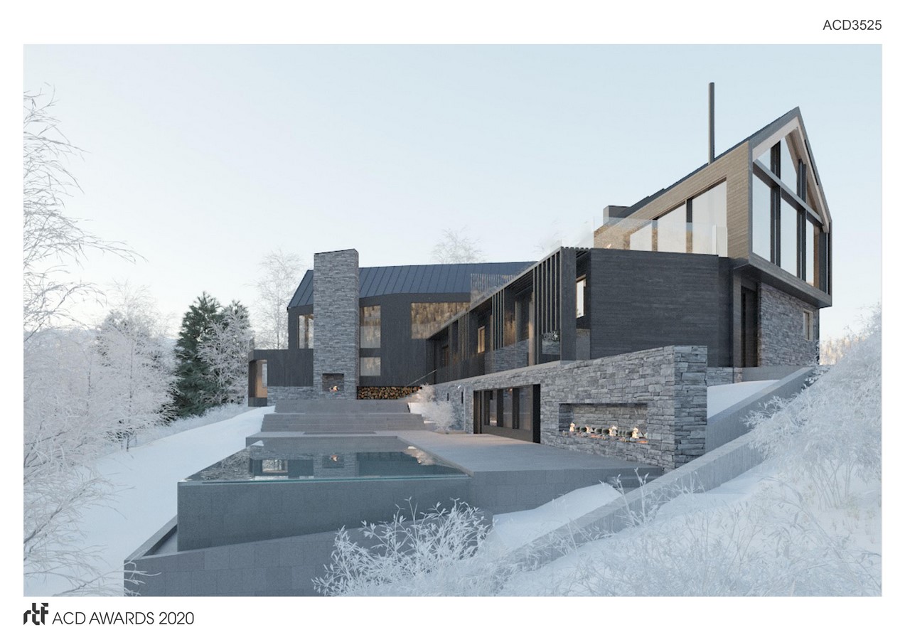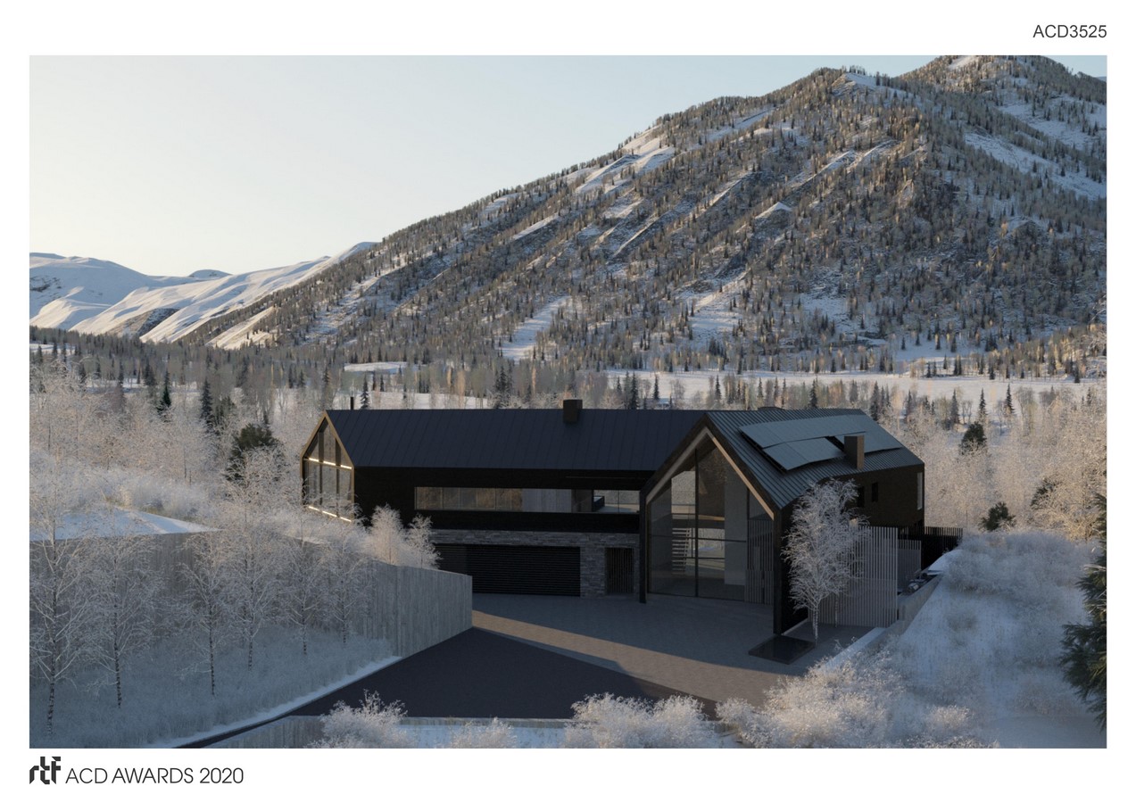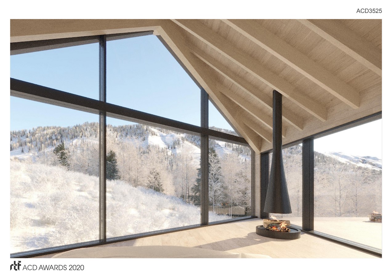 The house, which is under construction, is approached via a switch-back driveway framed by walls of textured concrete and a grove of aspen trees. The driveway leads to a motor court and the dramatic gabled entrance, which is in front of where the two wings overlap. Inside, the skeleton of the timber-and-steel roof is exposed, and integrated lighting bathes the custom-milled rafters and beams in a soft glow. The entrance is illuminated by a site-specific LED installation by Leo Villareal, the American artist. A cantilevered wood stair ascends to the living spaces, including the open eat-in kitchen in the west wing and the primary suite in the east wing, and down to the lounge/bar, at the fulcrum of the two wings, and the long outdoor terrace. Guest bedrooms are located in the west wing. A bunk bedroom and another guest bedroom are in the east wing. The terrace, on the south side of the lounge, has three levels: the upper terrace features a large fireplace for barbecuing; the middle terrace has a fire-pit with built-in seating; the lower terrace a hot tub and long pool, opposite the gym. The garage is located on the east wing’s main level.