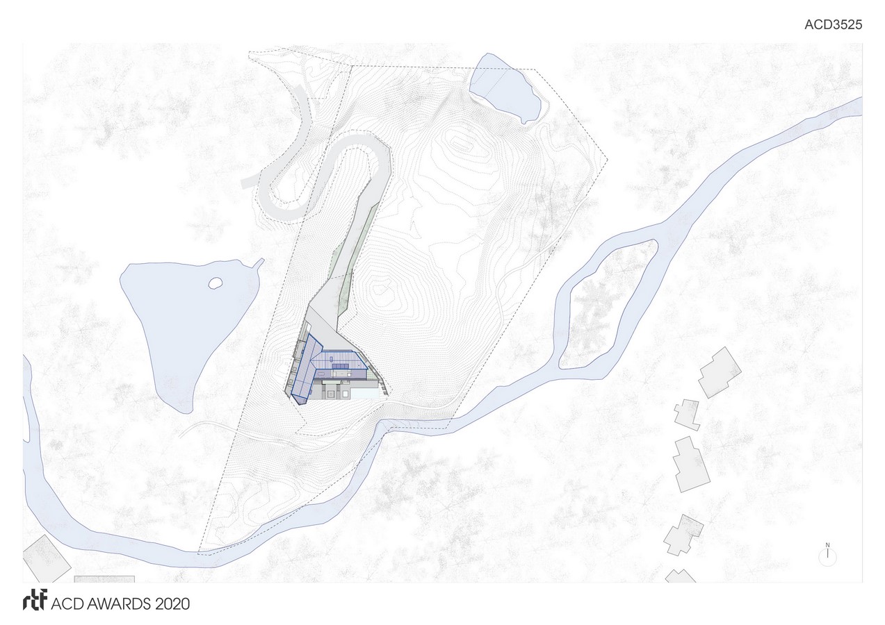 SMA has compressed or abstracted this “clustering” into two gable-roofed wings that form an “imperfect” chevron—“imperfect” because the west wing extends beyond the east wing, instead of meeting at a point, creating an exciting dynamic, beyond the point of slippage, for the two-story gabled entrance, and pushing the contemporary rigor of the design. The two-winged shape allows the owners, whether inside the house or outside on the terraces, to engage directly with the beauty of their surroundings.
