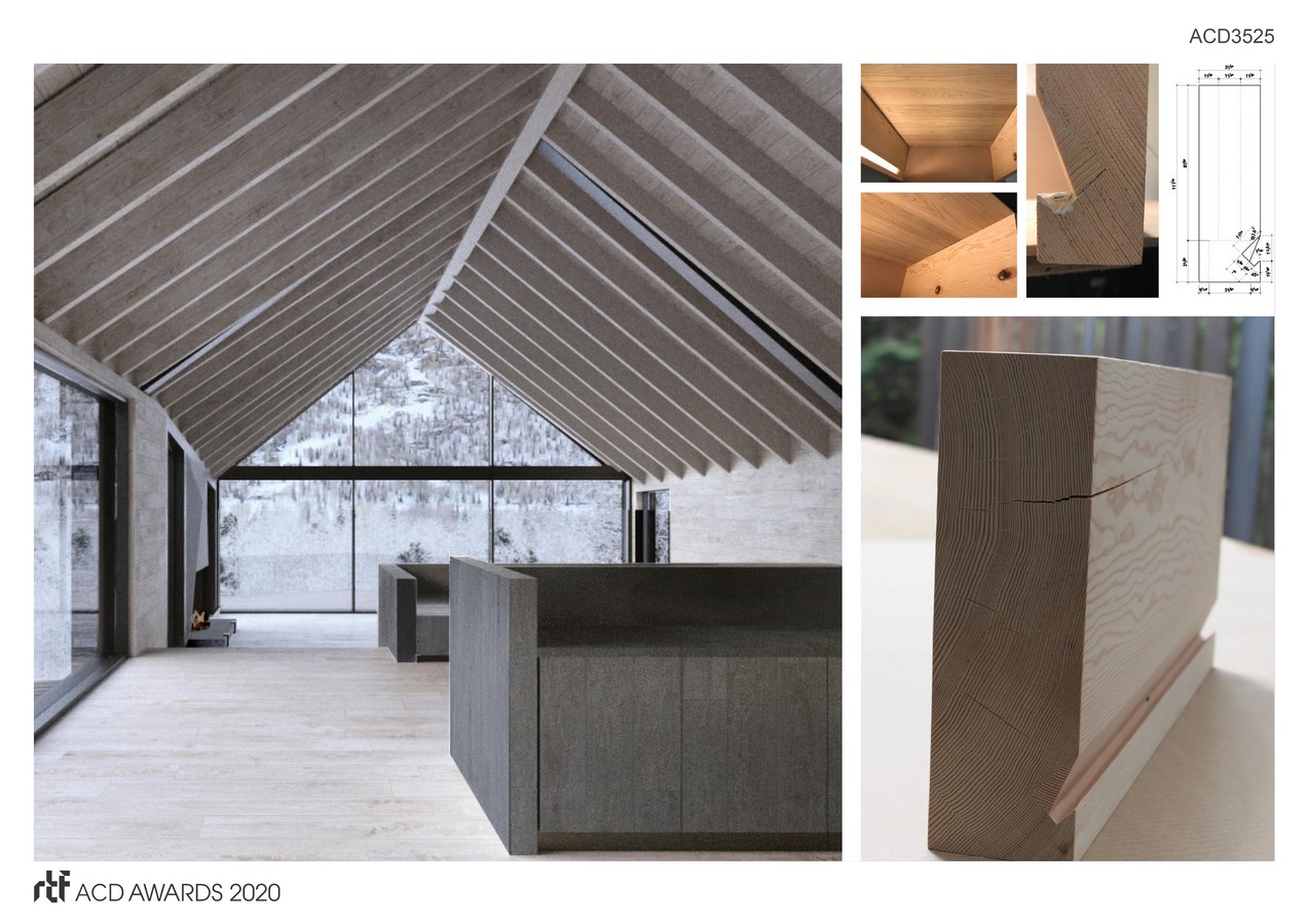 The exterior of the house is clad in dark-stained cedar, standing seamed metal, and reclaimed stone. The interior has light- and dark-stained oak paneling. Vertical wood-slat screens are used throughout to reflect the natural setting, as well as to ensure privacy and protection from the elements.