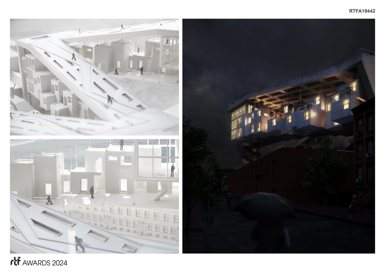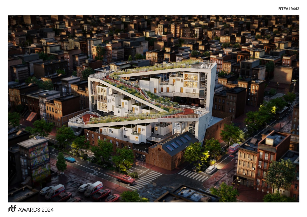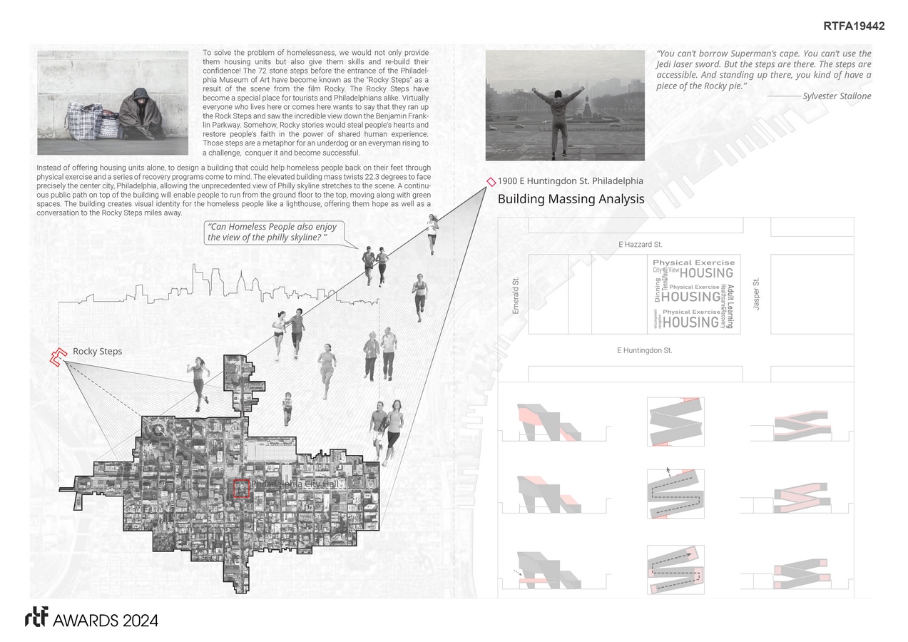 Architecture possesses the potential to foster healing both for individuals and communities. When buildings reflect the cultural heritage and aspirations of a place, they can contribute significantly to this healing process. This project seeks to leverage architecture to tackle Philadelphia’s housing crisis through the establishment of transitional housing. It offers temporary shelter solutions for homeless individuals, facilitating their transition away from street life, alongside crucial support services for short-term residents. During the initial site survey, a drone was employed to capture aerial views, revealing the stark contrast between Philadelphia’s beautiful skyline and the dilapidated streets of North Philadelphia. This observation sparked the idea of providing the homeless population with access to such vistas. Every individual, regardless of their circumstances, deserves the opportunity to enjoy their city’s skyline—a symbol of hope and triumph, as depicted in the iconic “Rocky” scene.