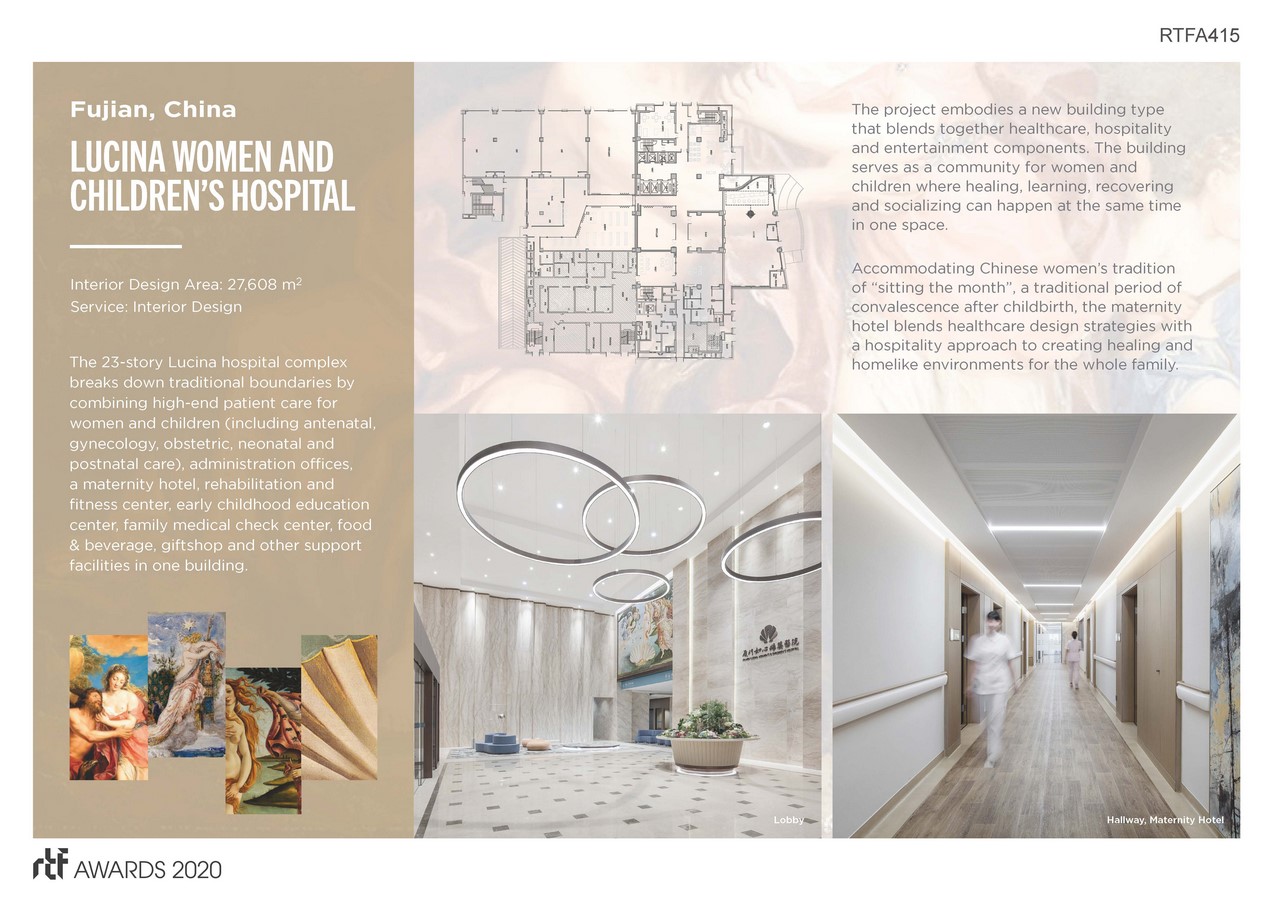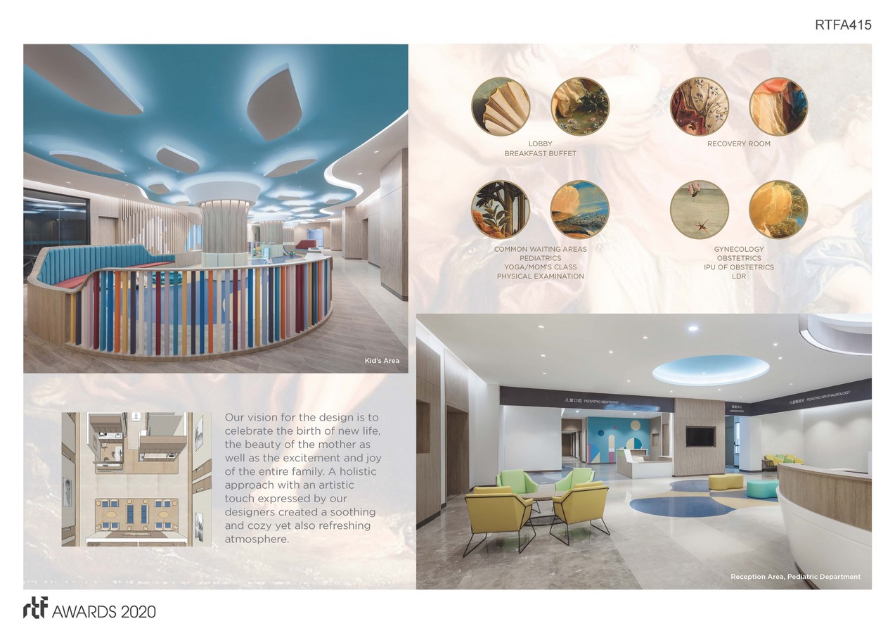 The project embodies a new building type that blends together healthcare, hospitality, and entertainment components. The building serves as a community for women and children where healing, learning, recovering and socializing can happen at the same time in one space. Accommodating Chinese women’s tradition of “sitting the month”, a traditional period of convalescence after childbirth, the maternity hotel blends healthcare design strategies with a hospitality approach to creating healing and homelike environments for the whole family.