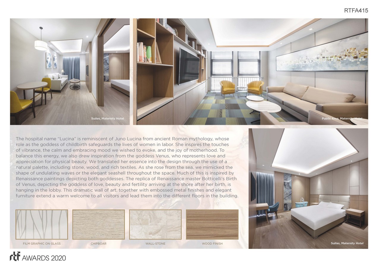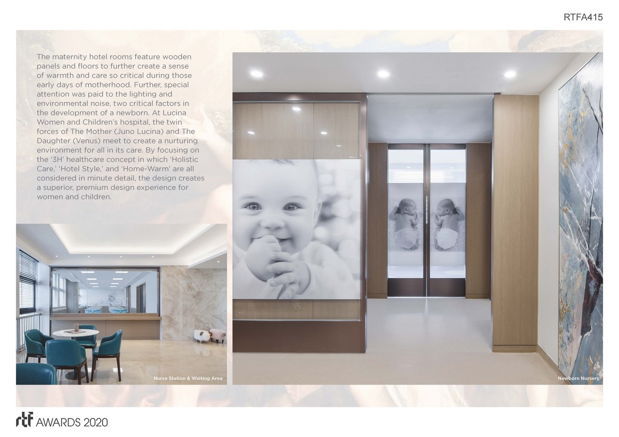 The maternity hotel rooms feature wooden panels and floors to further create a sense of warmth and care so critical during those early days of motherhood. Further, special attention was paid to the lighting and environmental noise, two critical factors in the development of a newborn. At Lucina Women and Children’s hospital, the twin forces of The Mother (Juno Lucina) and The Daughter (Venus) meet to create a nurturing environment for all in its care. By focusing on the ‘3H’ healthcare concept in which ‘Holistic Care,’ ‘Hotel Style,’ and ‘Home-Warm’ are all considered in minute detail, the design creates a superior, premium design experience for women and children.