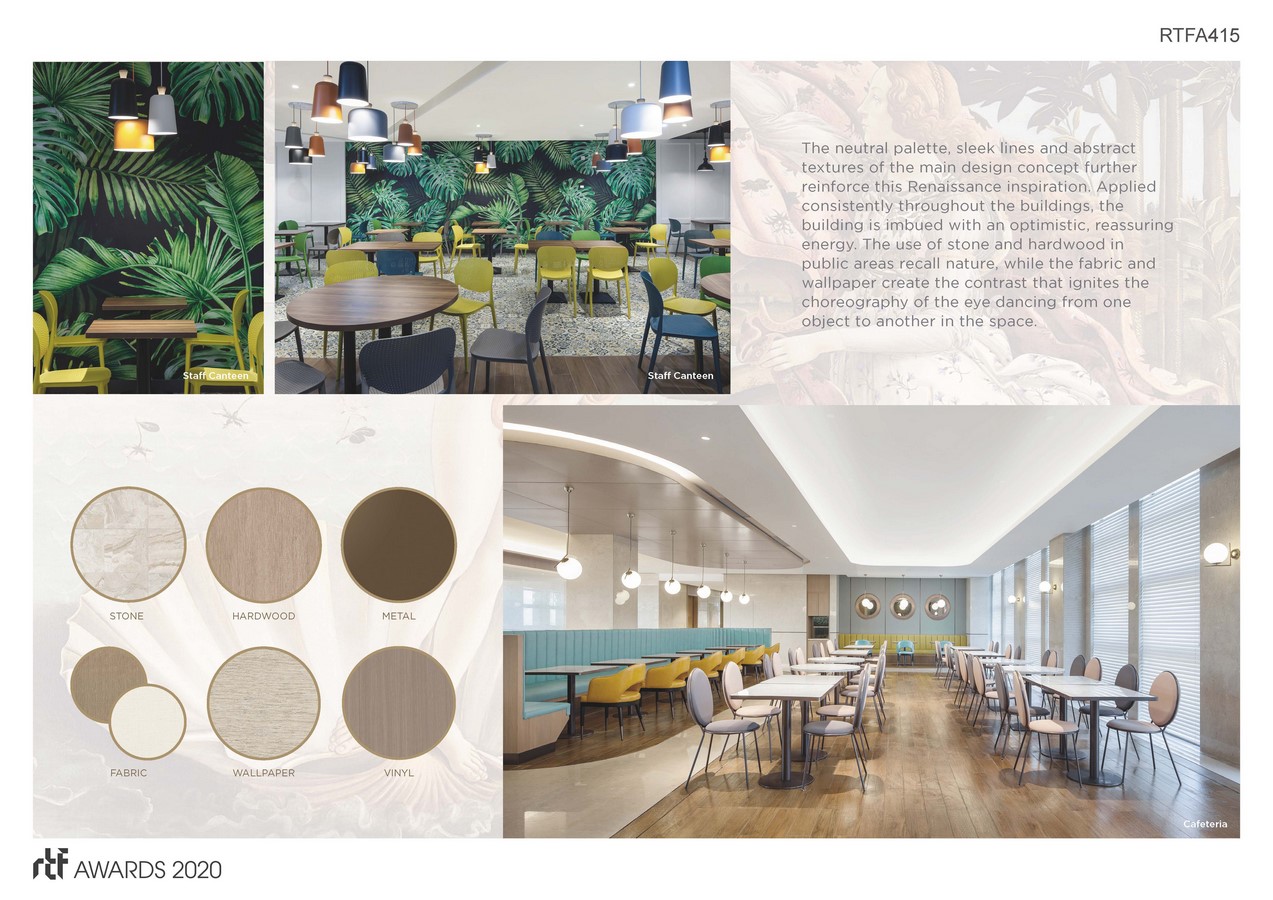 The neutral palette, sleek lines and abstract textures of the main design concept further reinforce this Renaissance inspiration. Applied consistently throughout the buildings, the building is imbued with optimistic, reassuring energy. The use of stone and hardwood in public areas recall nature, while the fabric and wallpaper create the contrast that ignites the choreography of the eye dancing from one object to another in the space.