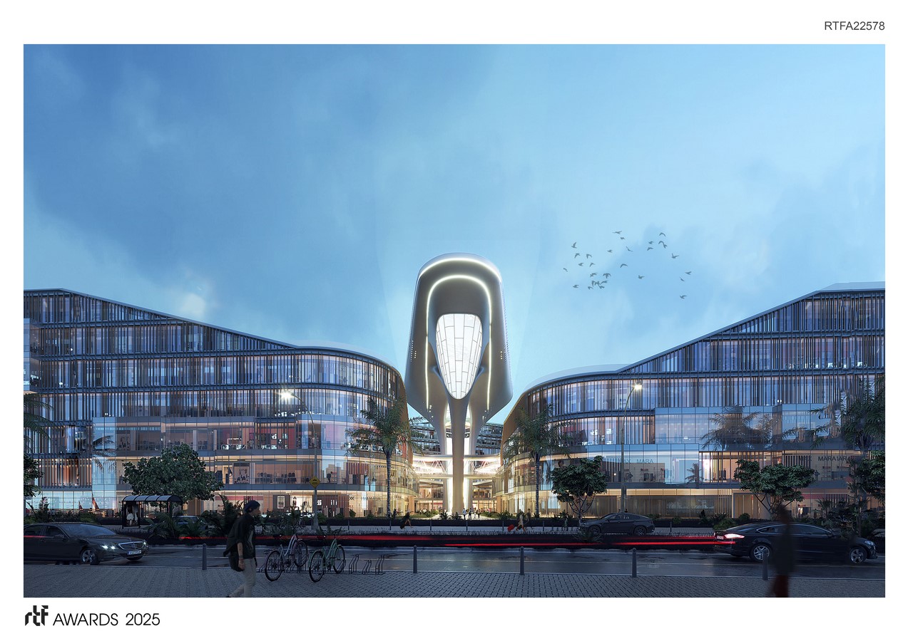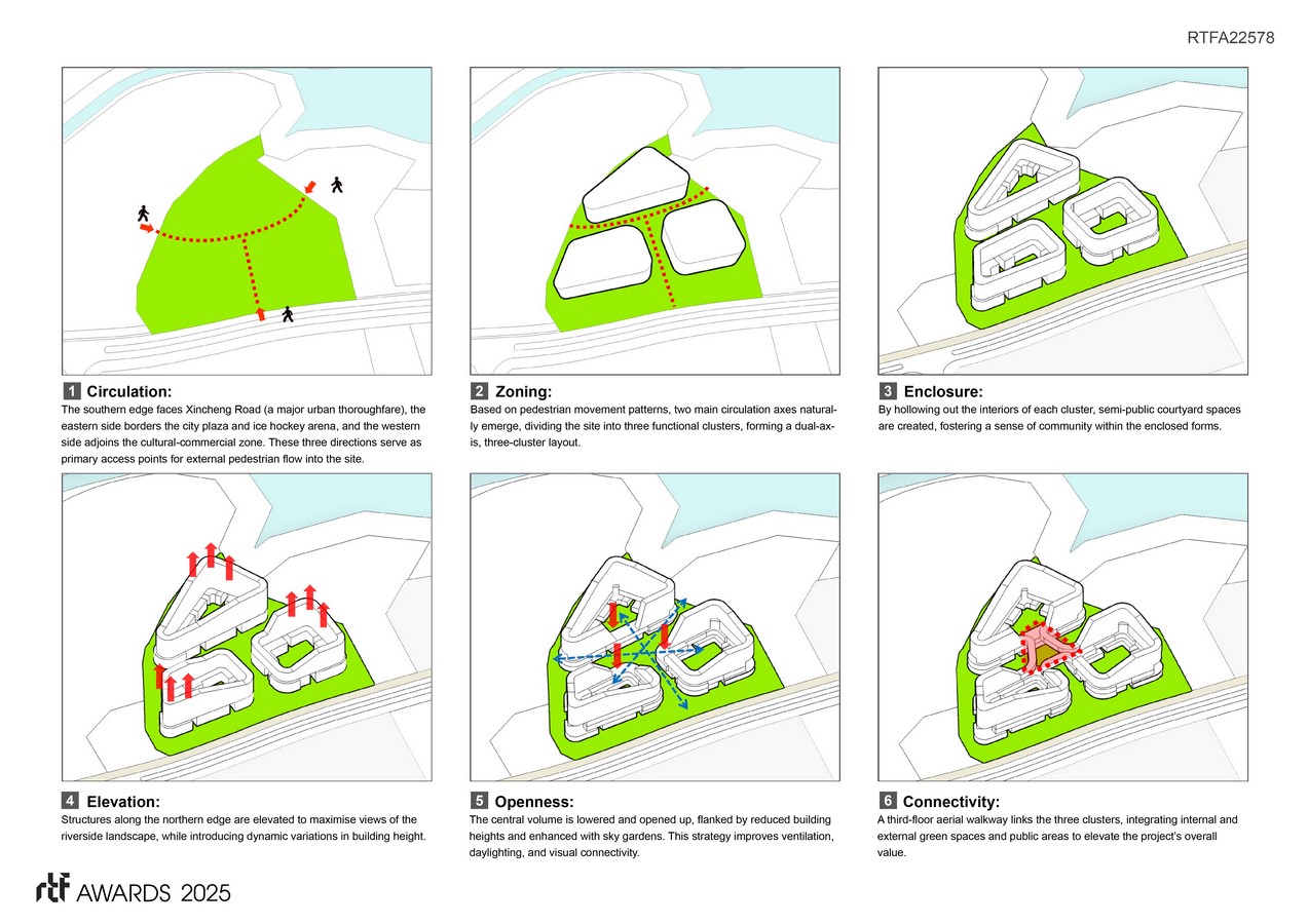 Centered around an aerial viewing platform, the design organises circulation axes and clusters based on pedestrian flow, ensuring seamless connections to surrounding roads and amenities. Each cluster features semi-public courtyards, while the third-floor walkway unites the three clusters into a “second ground level,” achieving architectural diversity within a cohesive whole.