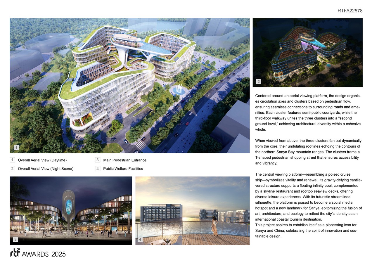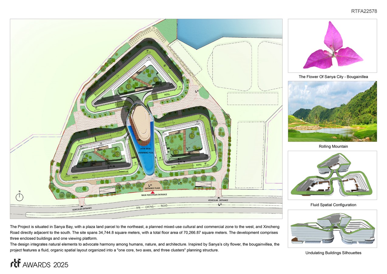 The project is situated in Sanya Bay, with a plaza land parcel to the northeast, a planned mixed-use cultural and commercial zone to the west, and Xincheng Road directly adjacent to the south. The site spans 34,744.8 square meters, with a total floor area of 70,266.87 square meters. The development comprises three enclosed buildings and one viewing platform.