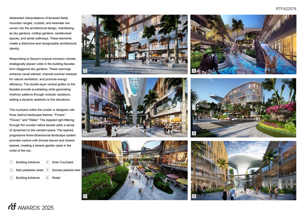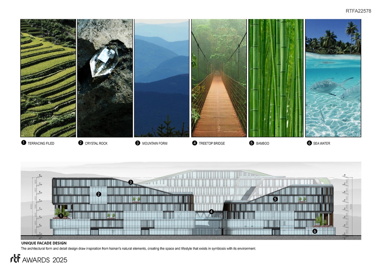 Abstracted interpretations of terraced fields, mountain ranges, crystals, and seawater are woven into the architectural design, manifesting as sky gardens, rooftop gardens, cantilevered spaces, and aerial walkways. These elements create a distinctive and recognisable architectural identity.