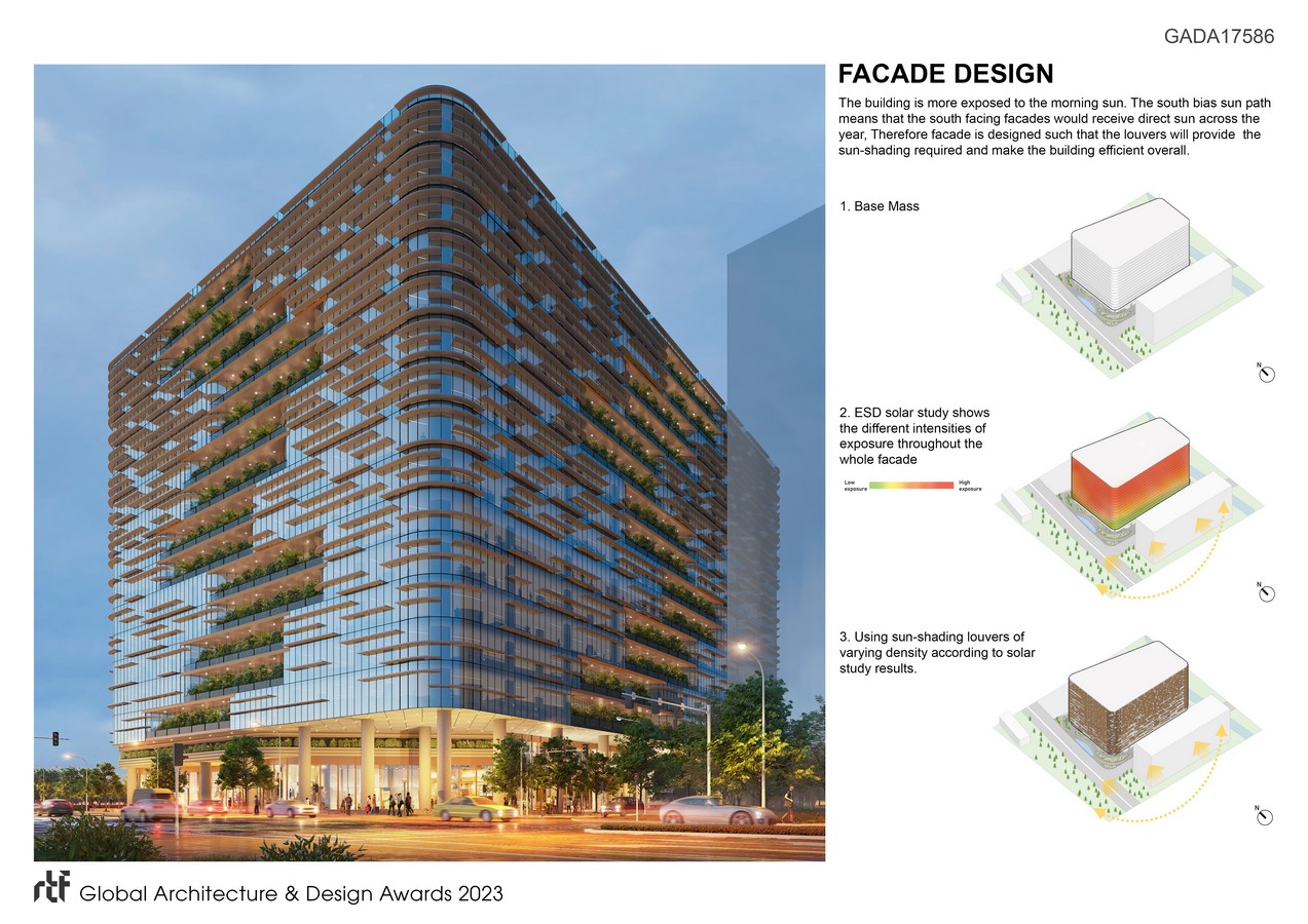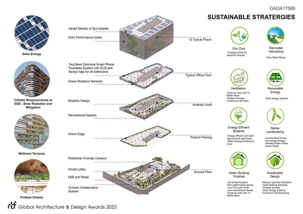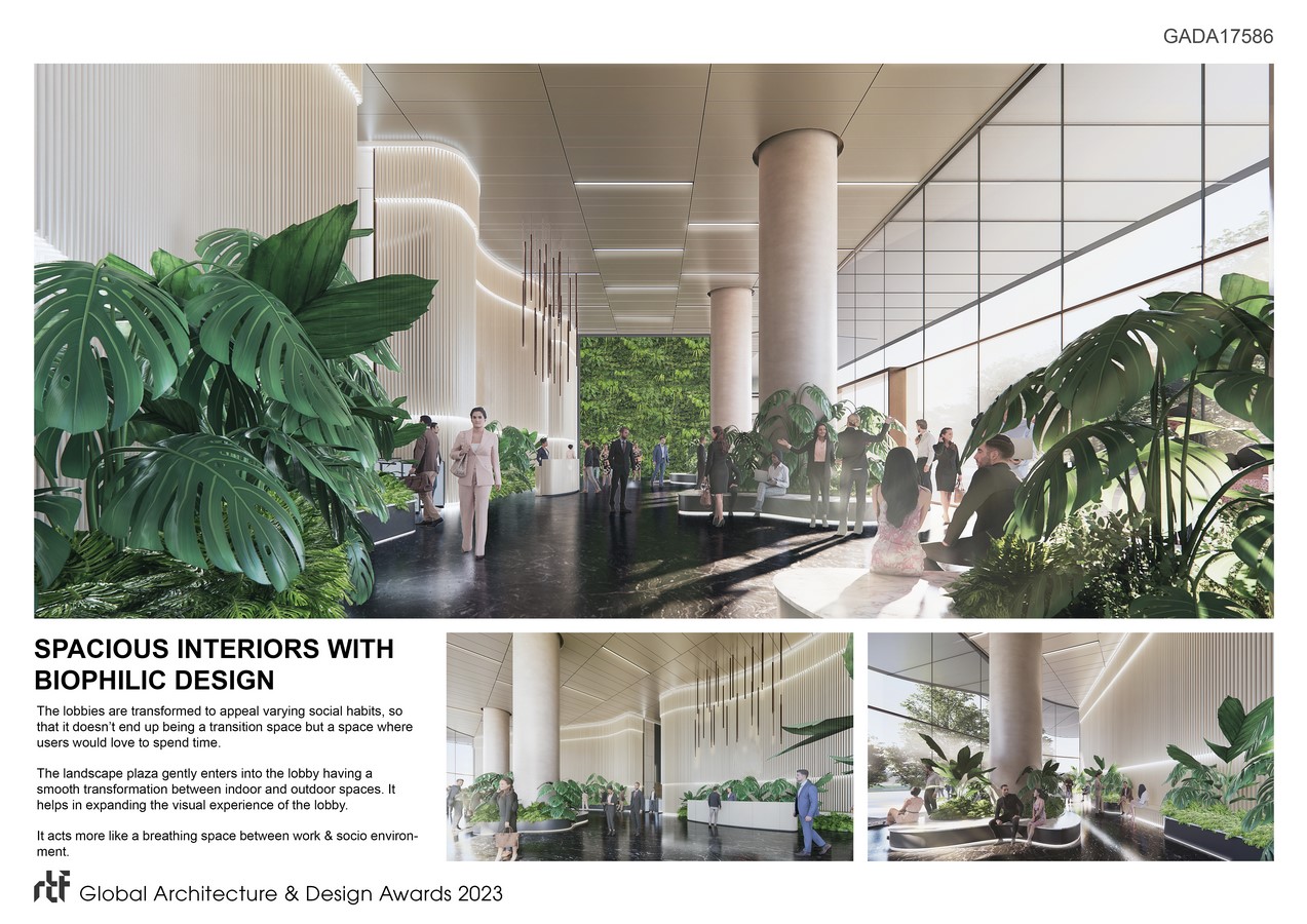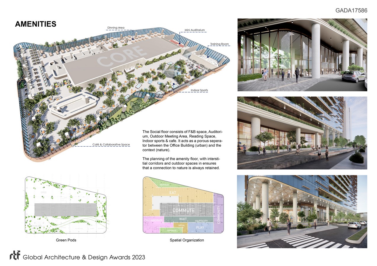 The design consists of three basements, each with a mix of stacked, puzzle and conventional parking as well as ground level parking. The Ground Floor features a social lobby, Retail and F&B spaces, a social plaza in addition to the arrival drop off. A 9m high lobby faces the access road whereas a 6m high lobby faces the rear. The floor above the podium parking accommodates a range of amenities including dining space for about 600 people, a café, and a restaurant. There also more private areas such as small auditorium, multipurpose room and a seminar room. An open gym with indoor games connects with a green terrace.