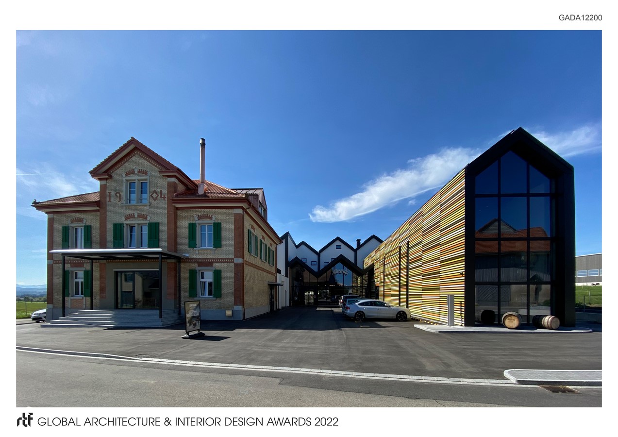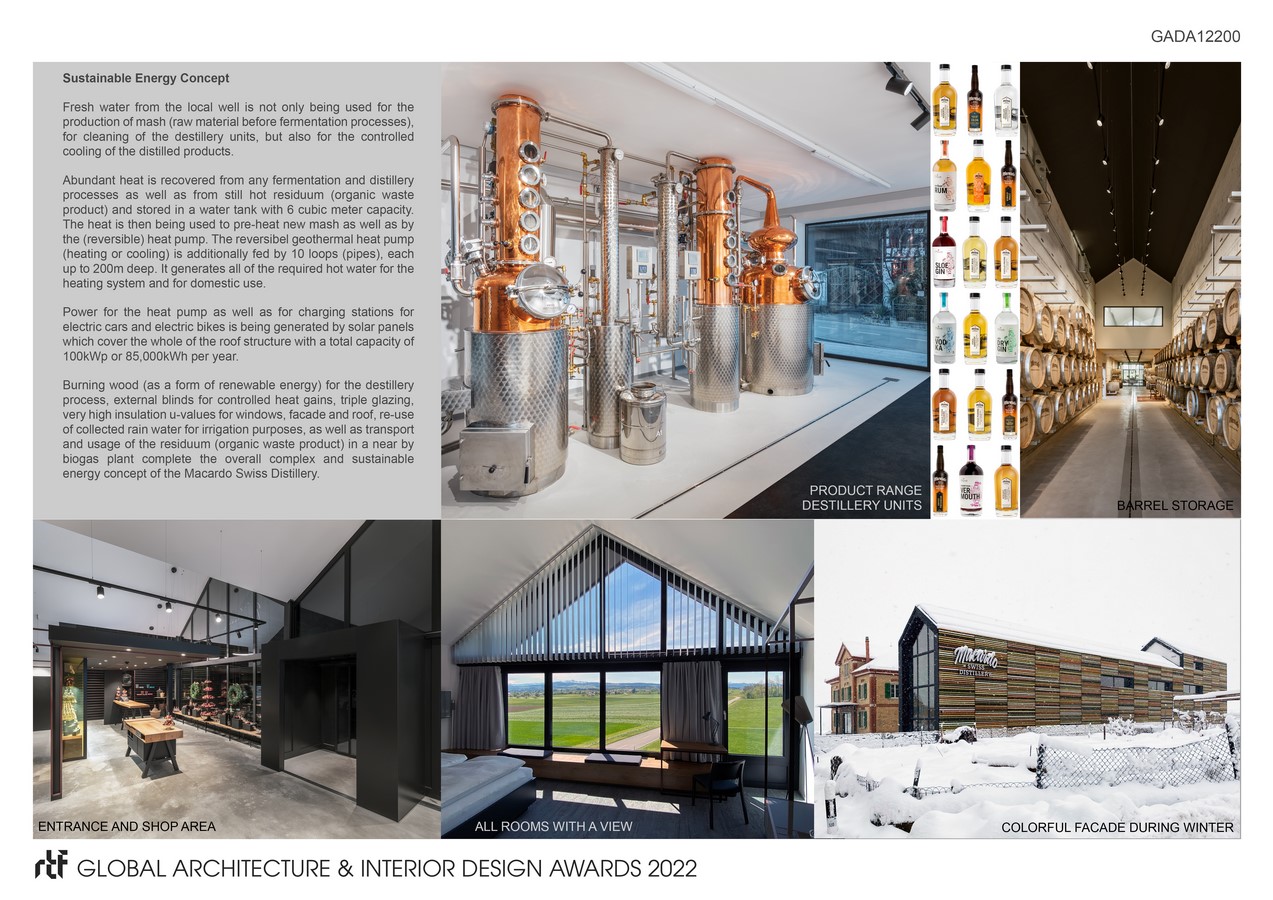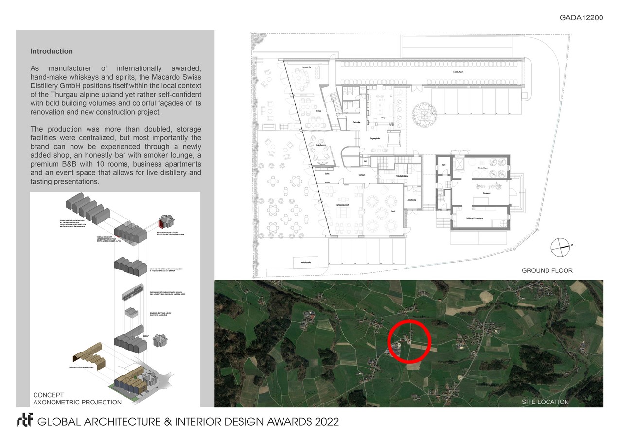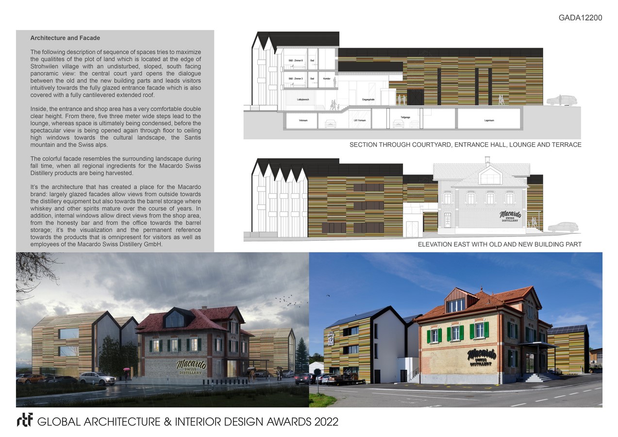 As manufacturer of internationally awarded, hand-make whiskeys and spirits, the Macardo Swiss Distillery GmbH positions itself within the local context of the Thurgau alpine upland yet rather self-confident with bold building volumes and colorful façades of its renovation and new construction project.
