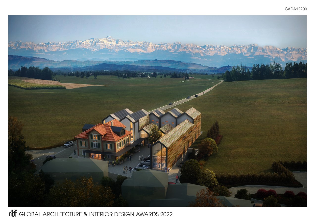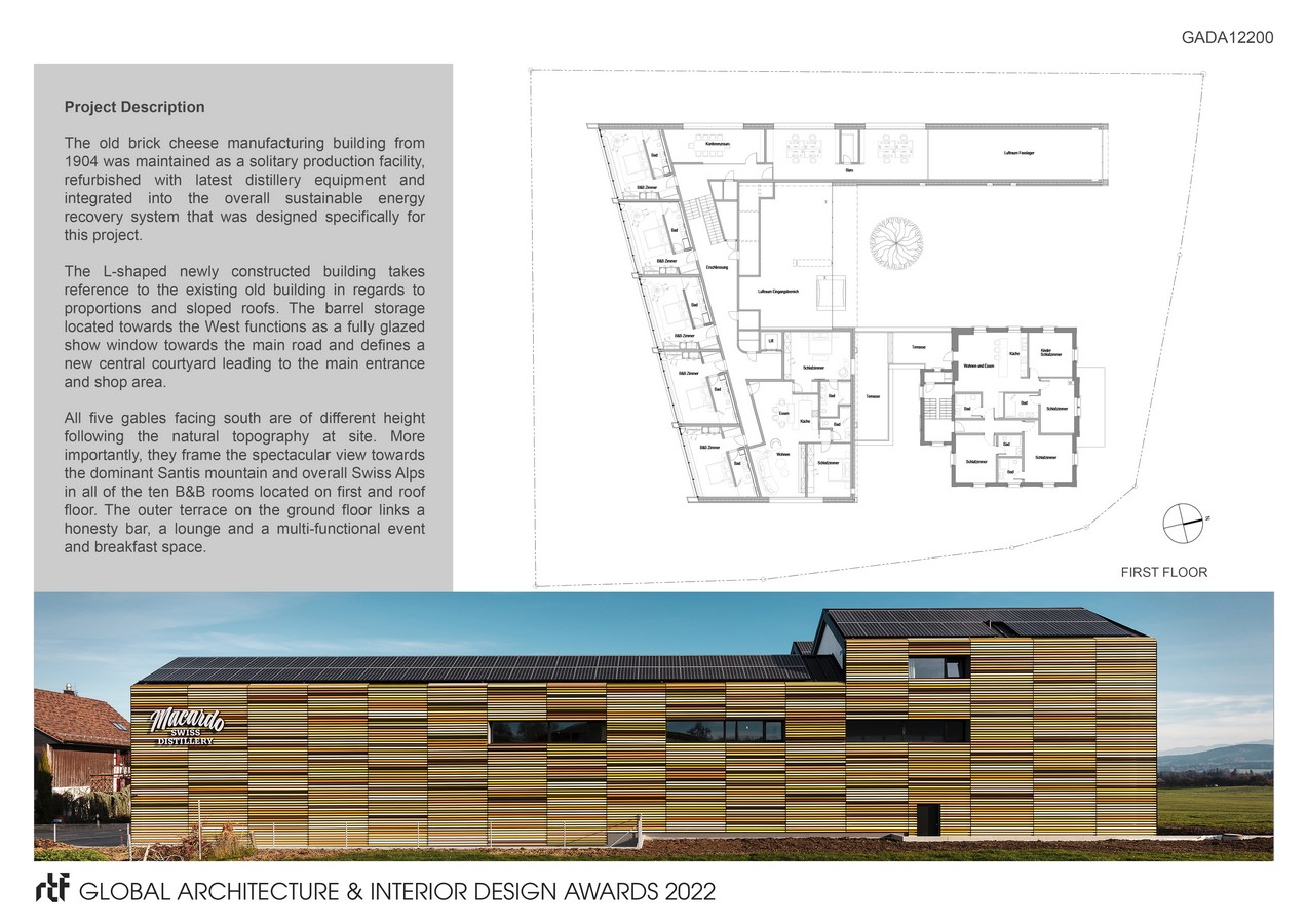 The old brick cheese manufacturing building from 1904 was maintained as a solitary production facility, refurbished with latest distillery equipment and integrated into the overall sustainable energy recovery system that was designed specifically for this project. The L-shaped newly constructed building takes reference to the existing old building in regards to proportions and sloped roofs. The barrel storage located towards the West functions as a fully glazed show window towards the main road and defines a new central courtyard leading to the main entrance and shop area. All five gables facing south are of different height following the natural topography at site. More importantly, they frame the spectacular view towards the dominant Santis mountain and overall Swiss Alps in all of the ten B&B rooms located on first and roof floor. The outer terrace on the ground floor links an honesty bar, a lounge and a multi-functional event and breakfast space.