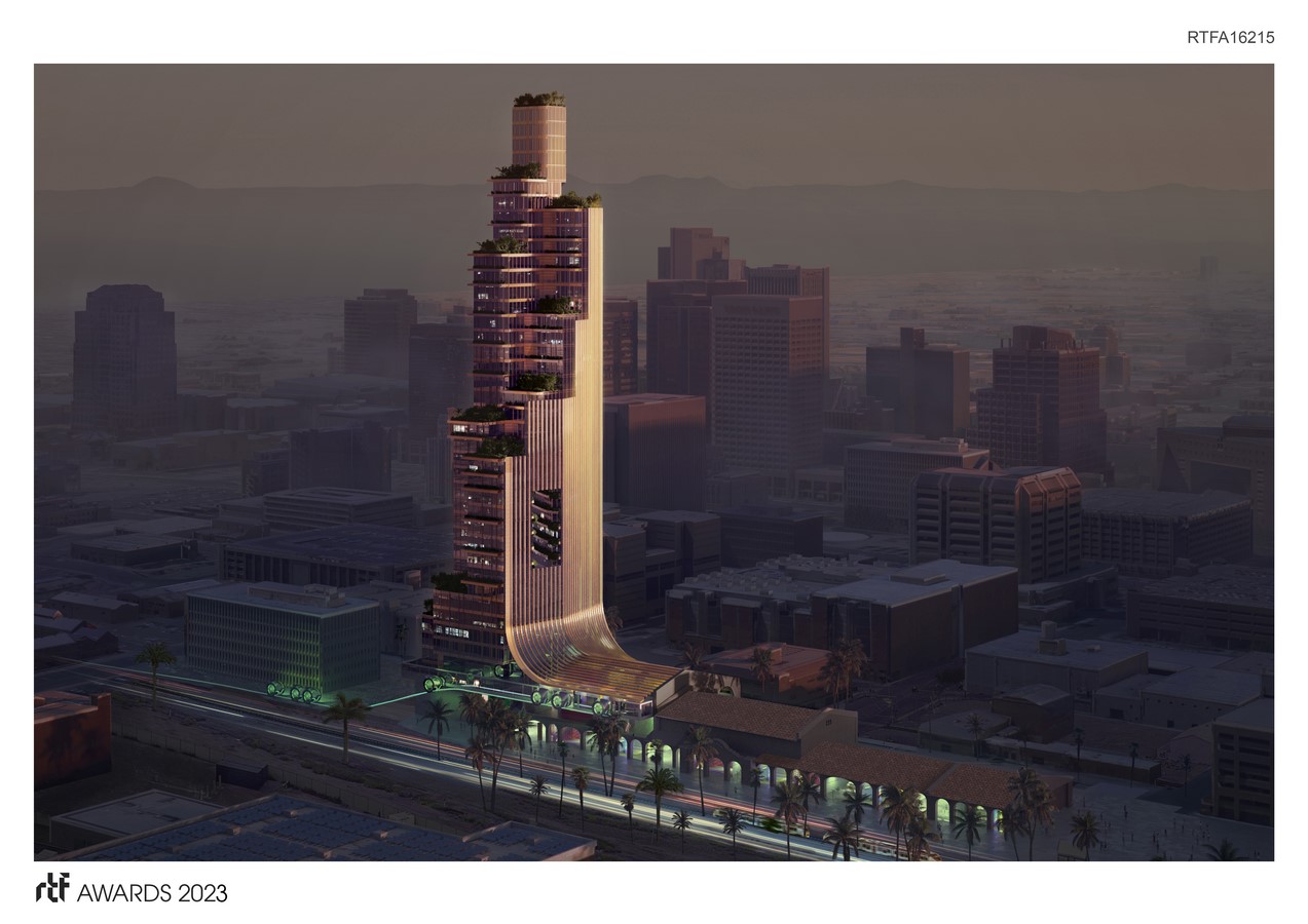 The farming core contains an open courtyard aperture that directs itself towards downtown, creating a passive cooling effect aimed at the infrastructural nucleus of the city. This new vertical vernacular creates and celebrates a new future from the relentlessly horizontal sprawl of the desert.
