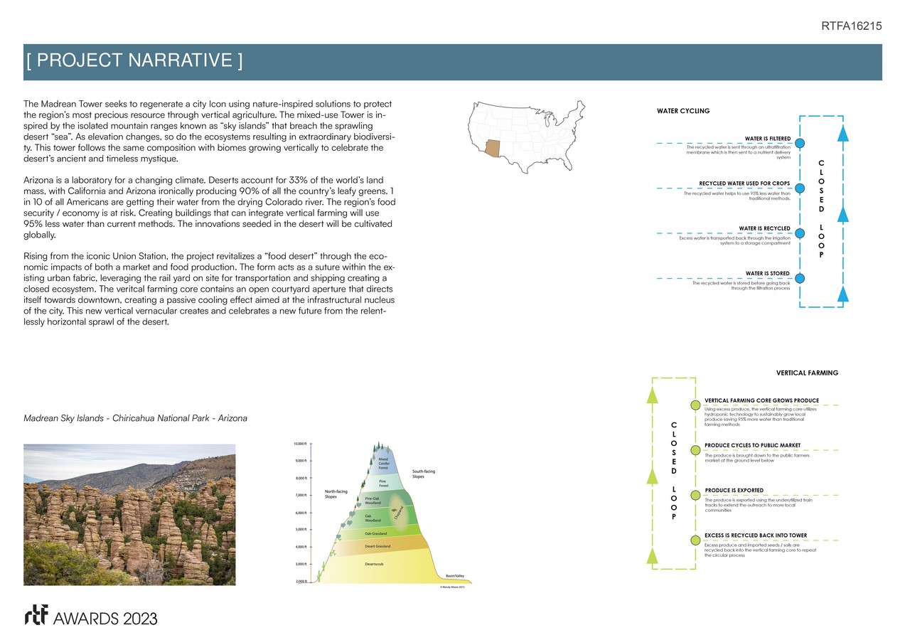 The Madrean Tower seeks to regenerate a city icon using nature-inspired solutions to protect the region’s most precious resource through vertical agriculture. The mixed-use tower is inspired by the isolated mountain ranges known as “sky islands” that breach the sprawling desert “sea.” As the elevation changes, so do the ecosystems resulting in extraordinary biodiversity. This tower follows the same composition with biomes growing vertically to celebrate the desert’s ancient and timeless mystique.