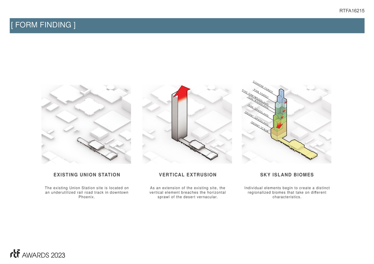 The Madrean Tower seeks to regenerate a city icon using nature-inspired solutions to protect the region’s most precious resource through vertical agriculture. The mixed-use tower is inspired by the isolated mountain ranges known as “sky islands” that breach the sprawling desert “sea.” As the elevation changes, so do the ecosystems resulting in extraordinary biodiversity. This tower follows the same composition with biomes growing vertically to celebrate the desert’s ancient and timeless mystique.