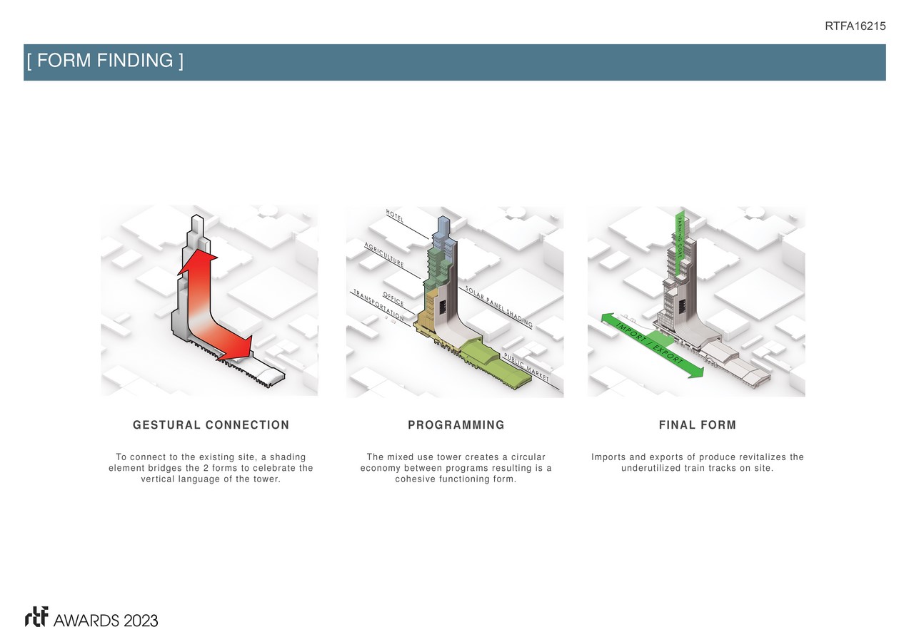 Rising from the iconic Union Station, the project revitalizes a “food desert” through the economic impacts of both a market and food production. The form acts as a suture within the existing urban fabric, leveraging the rail yard on site for transportation and shipping creating a closed ecosystem.