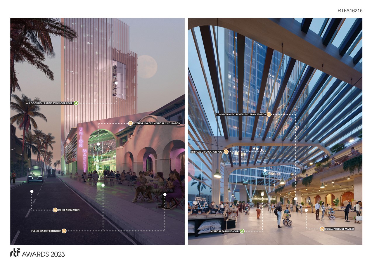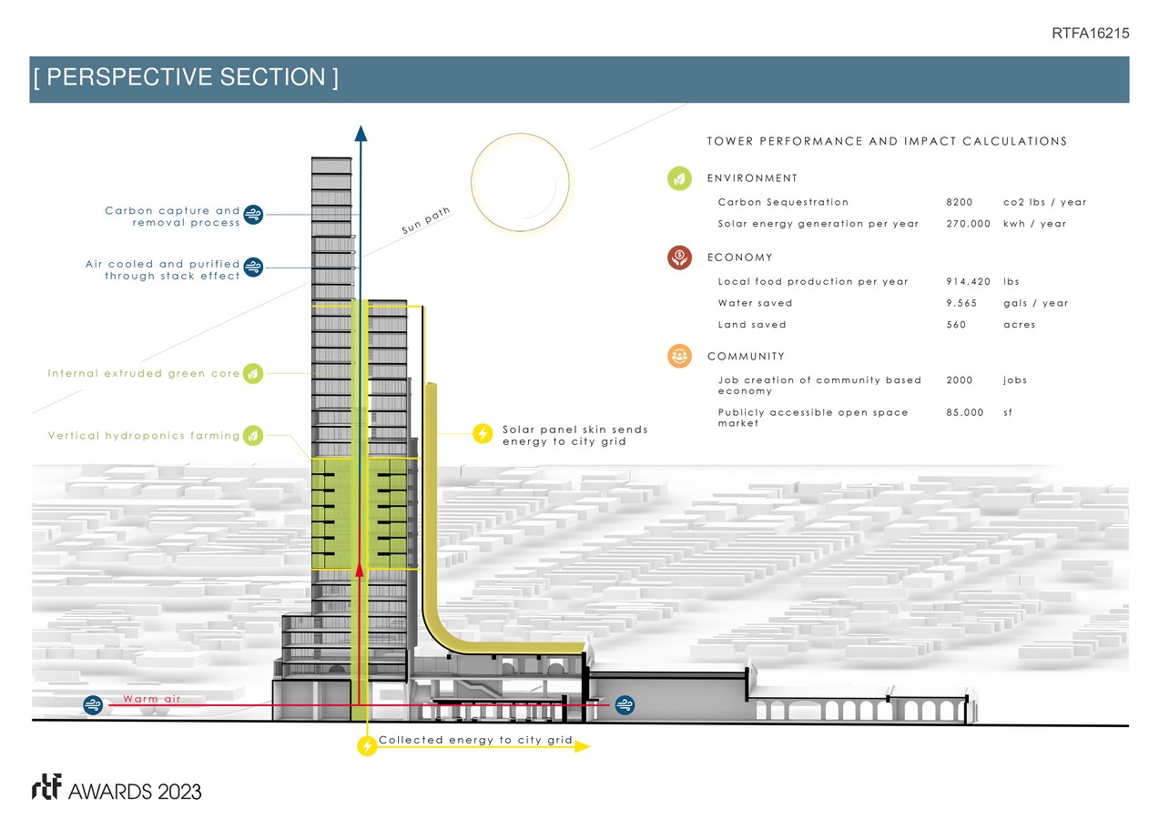 The farming core contains an open courtyard aperture that directs itself towards downtown, creating a passive cooling effect aimed at the infrastructural nucleus of the city. This new vertical vernacular creates and celebrates a new future from the relentlessly horizontal sprawl of the desert.