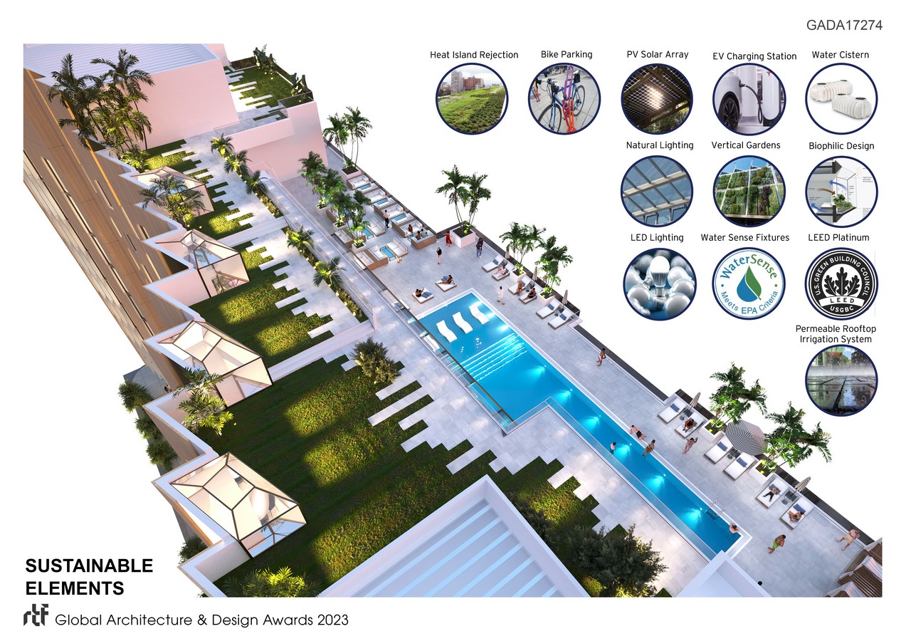 With sustainability as a key focus, the architect prioritized the building’s context within the city to maximize passive systems, conservation, and efficiency. The team expects to reach LEED Platinum certification after completion, making MainView one of the only LEED-certified hotels in the state of Florida. Rainwater management is provided through multiple cisterns and a central stormwater vault. A high-efficiency irrigation system allows water use reduction by 50%, including using rainwater runoff from the upper pool deck to irrigate the “green walls”. These vegetated areas are featured within 25% of all open space areas. WaterSense fixtures will be used indoors, also contributing to water-use reduction. Electric car parking spots are available accompanied by the fully-electric Tesla valet service. Drop-offs supply shading for users and an array structure of photovoltaic solar panels provides shaded pool access. The sawtooth design on Wallace Avenue brings natural daylighting into rooms, hallways, and the main lobby and purposefully combines energy, structure, and light into one visual narrative in order to enhance the LEED and sustainable goals of the project.