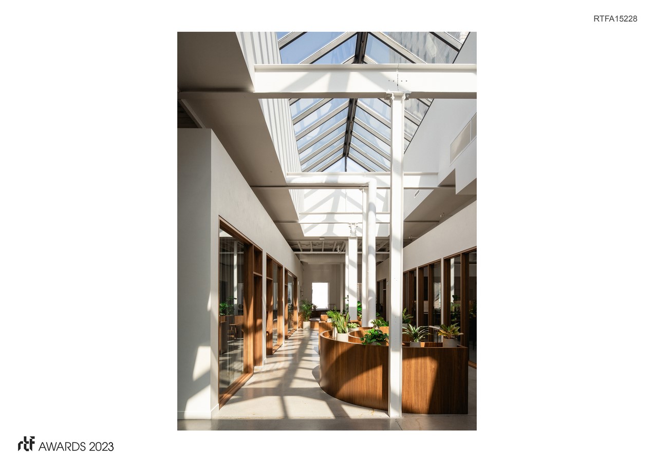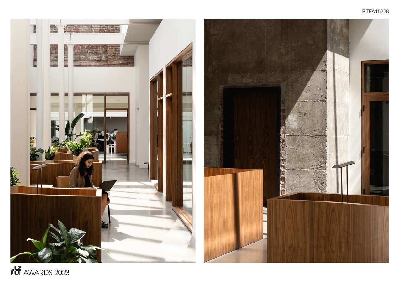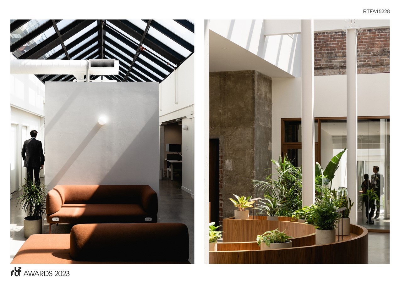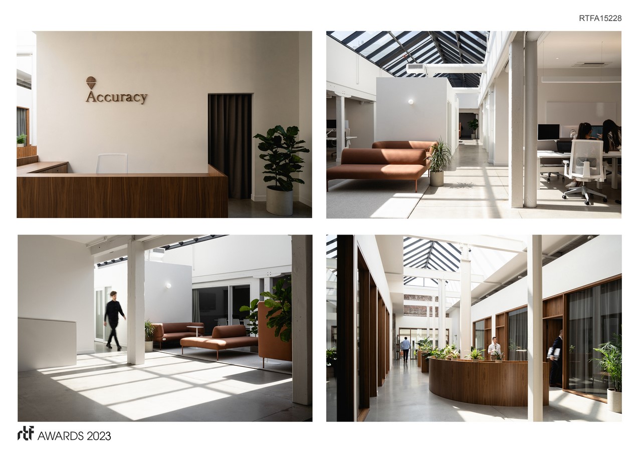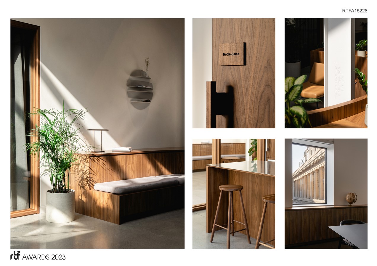 Maison Accuracy offers bright, soothing, and comfortable office spaces, where beauty inspires and encourages a return to work in person for more human and collaborative relationships. Taking advantage of the monumental skylights of the heritage building, meeting and working spaces are organized around central social nodes. The design explores a hybrid concept between open-plan offices and traditional closed conference rooms. The plan offers flexible spaces within an organic layout with an abundance of plants, wood and warm tones; it reflects the importance of creating social opportunities to promote creative exchanges. The curves of the central furniture contrast with the surrounding orthogonal shapes, bringing dynamism to the space and giving a unique balance and signature to the project.